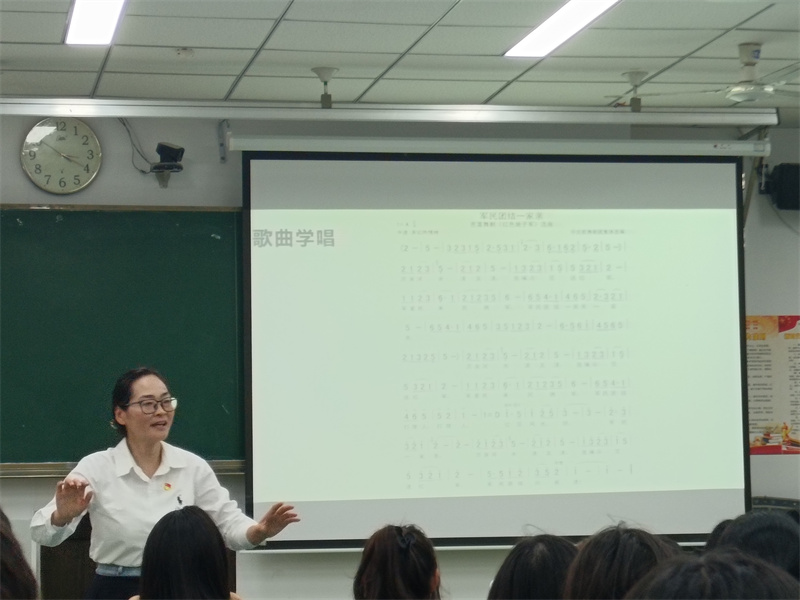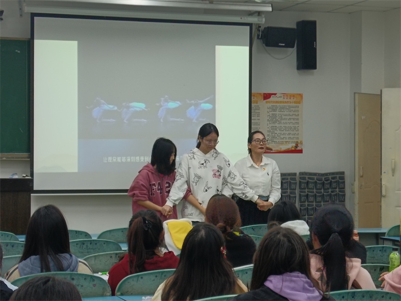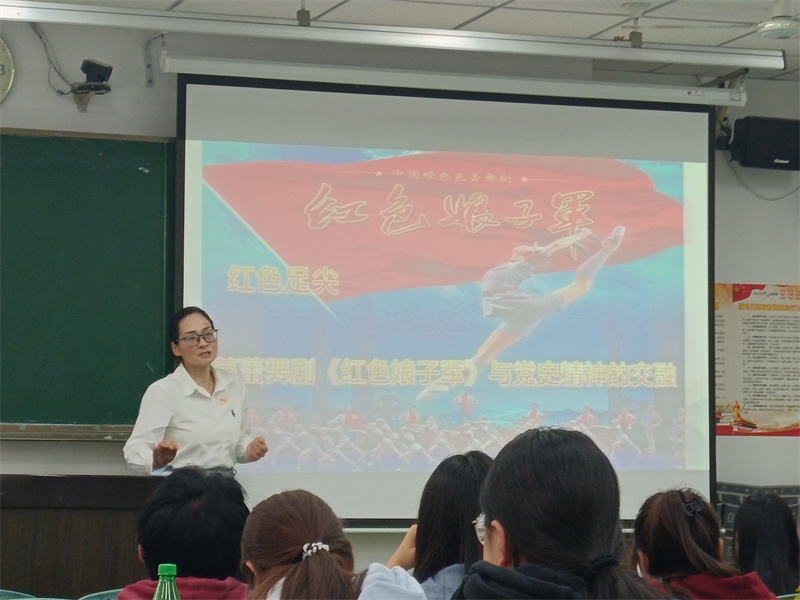 王老师以芭蕾舞剧《红色娘子军》为引子,深入浅出地讲解了该剧的历史背景、精神实质、艺术魅力与时代价值,同时巧妙融入红歌学唱环节,使课堂氛围既庄重又不失活泼。她着重阐述了党史精神的深刻内涵,强调坚定的共产主义信念是贯穿其中的灵魂。王老师旁征博引,用生动的案例和感人的故事,让党史精神跃然眼前,触动了在场每一位学生的心灵。