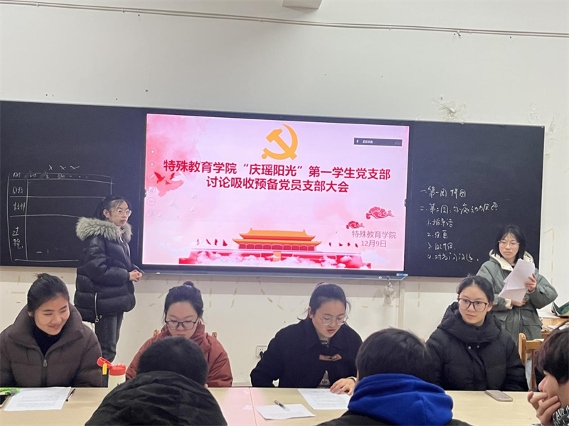 在第一学生党支部的大会上,由李晓畅担任主持人。会议开始,她首先介绍了大会的议程和目的,随后,支部成员就本次申请入党的同学的表现进行了充分的讨论和审议。大家一致认为,这些同学在学习、工作和思想上均表现突出,符合成为一名预备党员的条件。与此同时,在特教大楼A幢406教室,第二学生党支部也召开了同样的会议。该支部由袁梅玲主持。支部成员对发展对象进行了全面的评价,对他们的优点和不足进行了深入的剖析,支部正式党员全票通过,同意吸收他们为预备党员。在会议过程中,两个支部的党员们积极发言,充分展示了他们的党性修养和责任感。同时,会议也严格按照程序进行,确保了各项工作的规范性和严肃性。