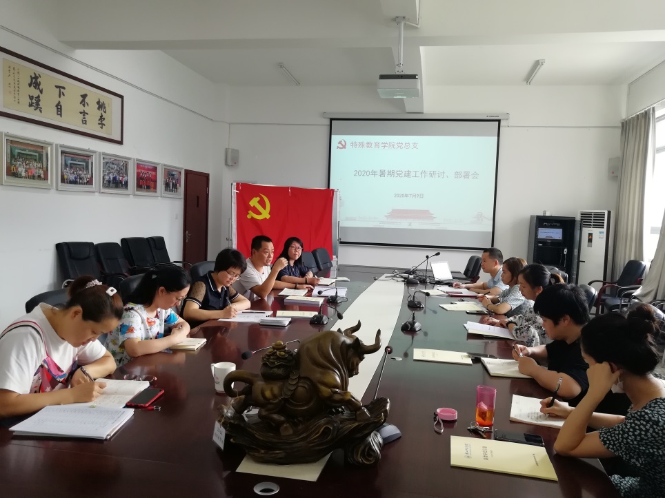本网讯(文/张嘉江 图/李红)7月9日上午,特教学院党总支在学院会议室召开了暑期党建工作研讨、部署会,党总支全体委员、师生党支部书记参加了会议。会议由主持学院党务工作的副书记刘宗泉主持。