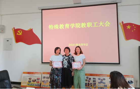 学院在9月9日全体教职工大会上,对去年考核优秀的教职工余菊芬、潘桂容、李燕进行了表彰,院长(执行)张梅为3位老师颁发了荣誉证书,并希望全体教职工向他们看齐,积极努力工作,不负青春,永葆奋斗者本色。随后,学院对我院3名困难教职工进行了慰问,并宣布发放相应慰问金,同时感谢章永教授为学院发展做出的积极贡献,希望章老师注意身体,继续为学院事业发展添砖加瓦;感谢王振洲博士为学校融合教育做出的努力,希望王老师以博士为新起点,为学院的发展献计出力;感谢刘琴老师为学院残疾人教育做出的努力,希望刘老师继续发挥优势,为残疾人教育提供新的思考与路径。