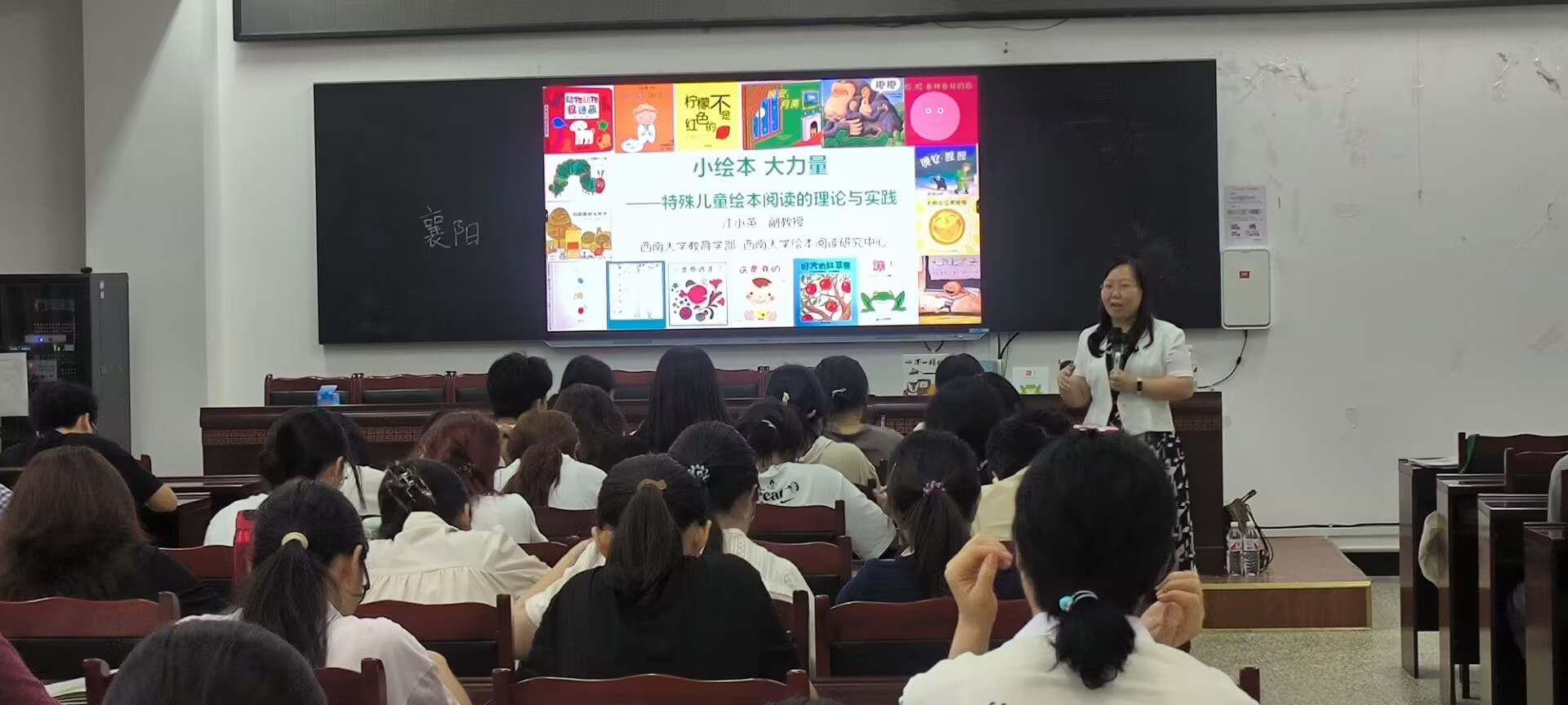 本网讯(文/图 梁剑)2025年6月5日晚,西南大学教育学部江小英副教授为我院学生带来了一场关于“小绘本·大力量——特殊儿童绘本阅读的理论与实践”的学术讲座,讲座由四川特殊教育发展研究中心主任梁剑主持。