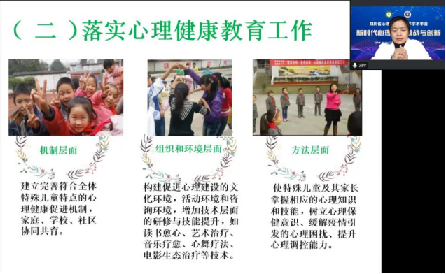 下午,我院教师刘琴在“后疫情时代的社会心理服务的经验与展望”的论坛二中,作了题为《后疫情时代特殊儿童的心理健康与服务体系》的主题报告。从后疫情时代特殊儿童心理健康的现状、面临的挑战,以及构建特殊儿童心理健康、心理支持与服务体系三大方面进行了分享。