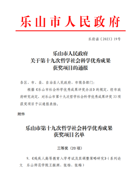 本网讯(图、文/王振洲)2月14日,乐山市人民政府公布了乐山市第十九次哲学社会科学优秀成果获奖项目名单,共评选出33项获奖项目。其中,我院王振洲博士关于《残疾人高等教育入学考试及其调整策略研究》系列论文荣获三等奖,为我院开展残疾人高等教育提供理论研究依据,促进残疾人高等教育质量的提升。(审核人:张梅)