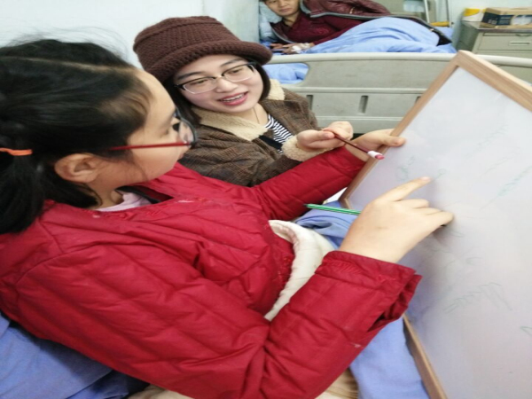 绪障碍儿童小雨在我校特殊儿童康复中心接受康复训练一年多了,和betway西汉姆联平台的老师、志愿者哥哥姐姐们结下了深厚的感情。近日,小雨因为在家煮饺子时被意外严重烫伤,得知这一消息后,刘秋竹、魏欣等老师带领志愿者们立即去医院看望了小雨,并为小雨安排了送教上门的服务。志愿者利用自己的空闲时间到医院给小雨开展手工和绘画的课程,帮小雨调适长期卧床的不良情绪,使无聊的住院时光增加了许多乐趣。