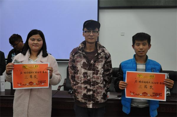 整场演讲比赛精彩纷呈,十六位演讲者各有风格,有精彩的讲解也有丰富的PPT展示。演讲者们都深入讲解了校园环境的不良现状以及解决方法,在场的听众们都感慨万分。活动尾声,学生分会陈超、旦增净美和袁国蓉为大家献上动听的歌曲,为比赛锦上添花。最终,秦鑫同学以其优秀出众的演讲拔得头筹,其他同学也表现优异,获得奖励,各位评委为获奖者颁发奖状,合影留念。