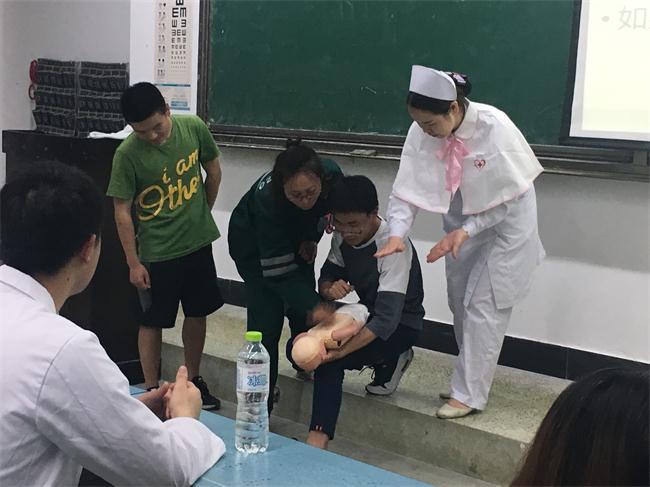 为进一步在学生中普及安全技能知识,5月10日晚七点,特教学院特邀乐山市人民医院“南丁格尔”护理志愿服务小分队来校,开展急救技能培训活动。在行知楼225教室,近20名医护人员对200余名学生进行了心肺复苏术(CPR)、气道梗阻急救法(海姆立克急救法)、儿童溺水急救处理实训。