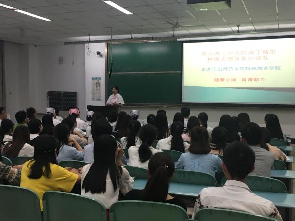 首先,乐山市人民医院马智群主任讲述了此次活动的初衷,希望急救技能能走进各个社会阶层,也希望同学们能结合专业学习,在未来的工作学习中能做到“医教结合”,运用专业的急救方法开展急救工作。接下来,由培训老师魏艳、廖芹讲解气道梗阻的表现,以及突发状况的一些处理方法,并邀请同学协助,模拟气道梗阻进行急救演示。随后,由罗希护士讲解儿童溺水的急救处理,预防的措施、溺水后的急救、临床特点、最佳急救时间和急救方法——心肺复苏术,她使用模型生动形象地进行了心肺复苏的演示,向同学们再现了护士们争分夺秒的抢救溺水病人的紧急情况。医护人员不仅展现了她们对急救技能的娴熟状态,他们仔细的讲解,认真的解答也充分体现出了白衣天使高尚、无私奉献精神,深深地打动了特教专业的同学们。