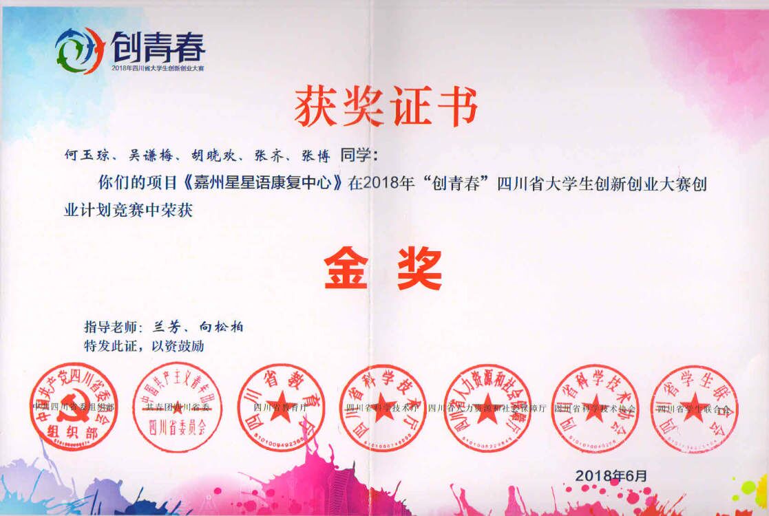 在刚刚结束的由中共四川省委组织部、中共四川省委宣传部、共青团四川省委、四川省教育厅等联合主办的2018“创青春”四川省大学生创新创业大赛决赛中,我校betway西汉姆联平台参赛项目《嘉州星星语康复中心》斩获金奖,这也是目前我校在该项赛事中首次实现金奖项目零的突破。