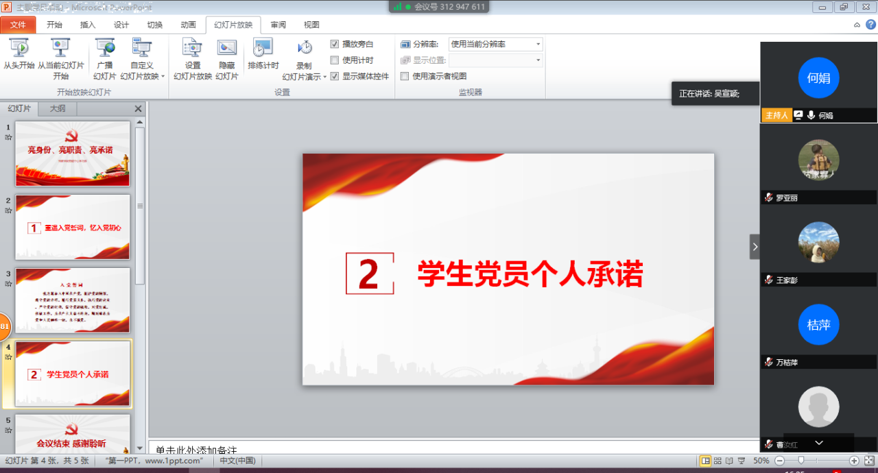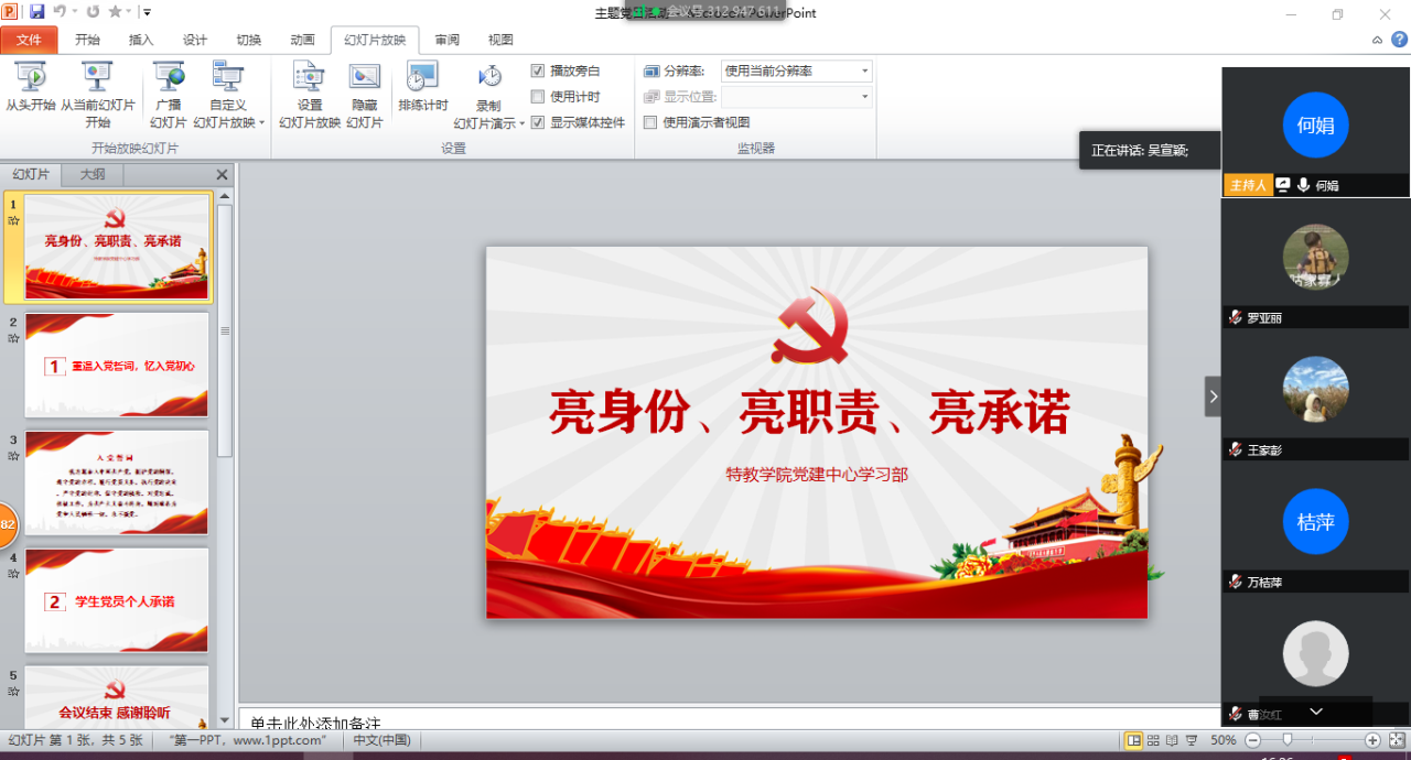 本网讯(文、图/艾玉梅)为增强党组织的凝聚力、战斗力和号召力,活跃党内活动,提高党员素质和水平,发挥党员先锋模范作用,我院学生党支部于4月17日组织开展“亮身份、亮职责、亮承诺”的主题党日活动。由于疫情影响,本次活动庆瑶阳光第一学生党支部和庆瑶阳光第二学生党支部分别通过办公软件“腾讯会议”线上进行。