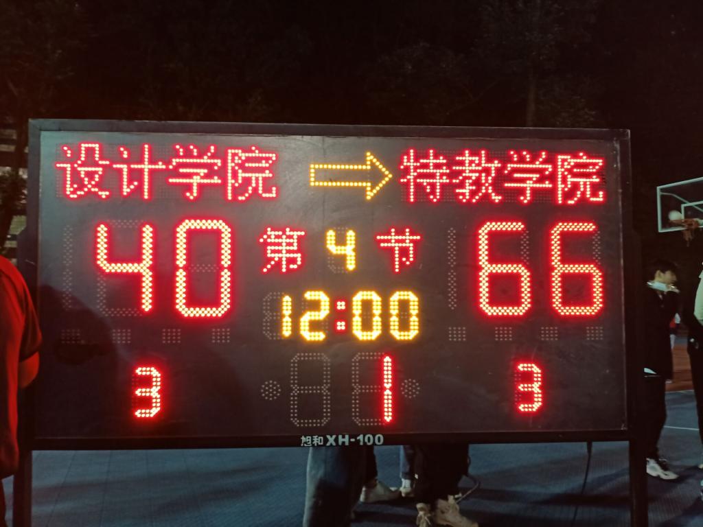 11月8日晚,我院篮球联赛再次开场。特教运动员们以坚定的信念走进南操场。比赛分为4节,第一节开始。在裁判的一声令下,大家开始抢夺篮球,但特教篮球队员以迅雷之速夺得了篮球。13号韩鸿昊一个帅气的一分球,首球进框。欢呼声接连不断。紧接着30号眭强两个一分球进框,赛场上的对战进入白热化阶段,观众们为激烈的战况欢呼喝彩。第一节比赛比分为5:20,特教学院暂时领先。第二节比赛开始,5号邓竹均远投三分轰动了全场,队员们打着手势,比划着战略,从容不迫地应对设计学院的“进攻”。第二节比赛以22:37闭幕。音乐声随即响起,啦啦队员活力满满的进行舞蹈表演,为运动员们加油鼓气。第三节比赛由女子篮球队进行对抗,7号刘丹首球突击一分球,紧随其后的是32号陈微投篮成功。场上的掌声热烈持久,最终以23:47暂时领先。最后一节决赛开始,15号罗浩然二分球得分,5号邓均竹再次远投三分球激起大家的欢呼,比赛进入关键时刻。在最后五分钟的时间里,设计学院激烈的角逐也没能超过特教学院,比分定格在40:66,特教学院取得本次比赛的胜利。
