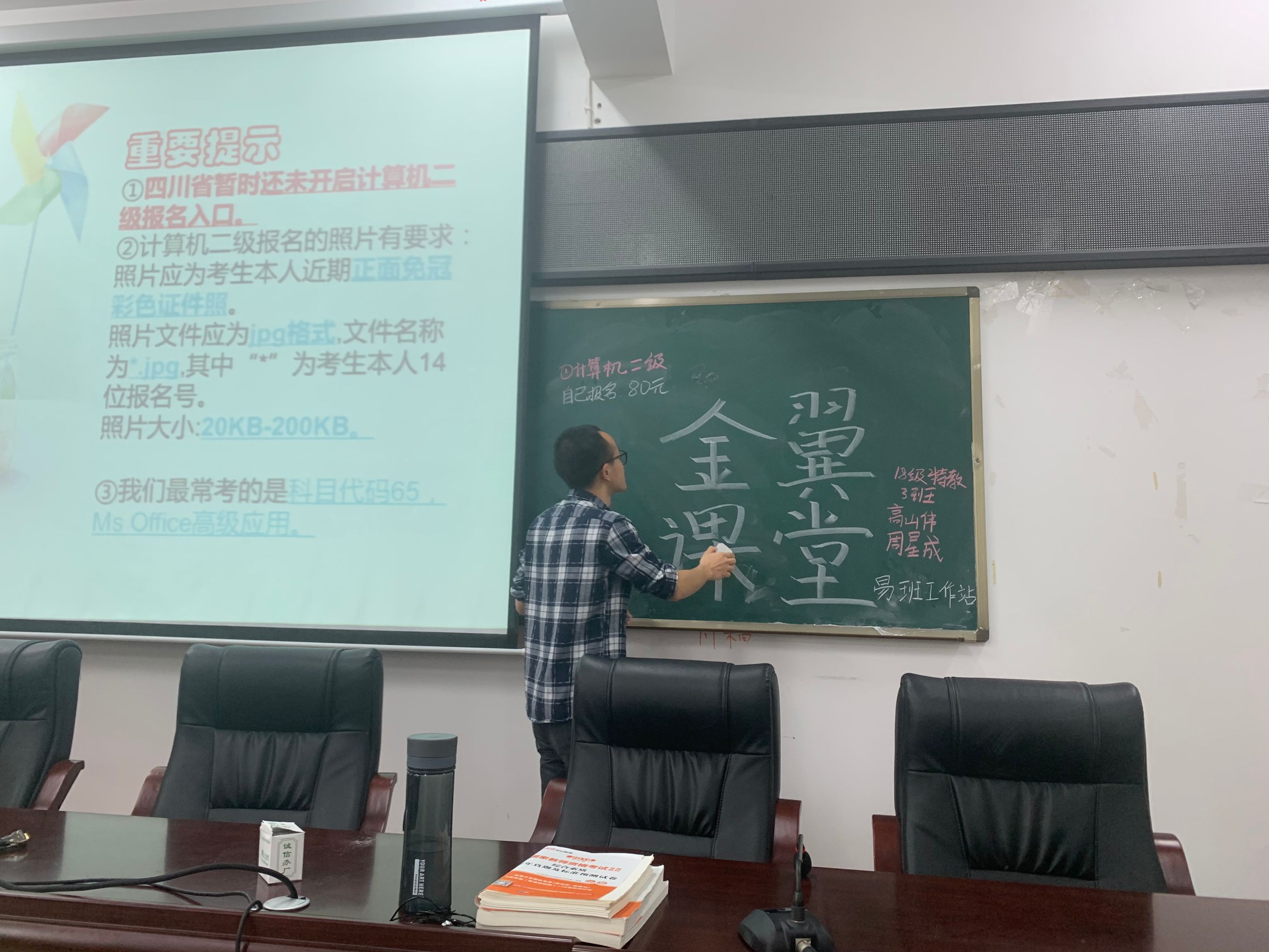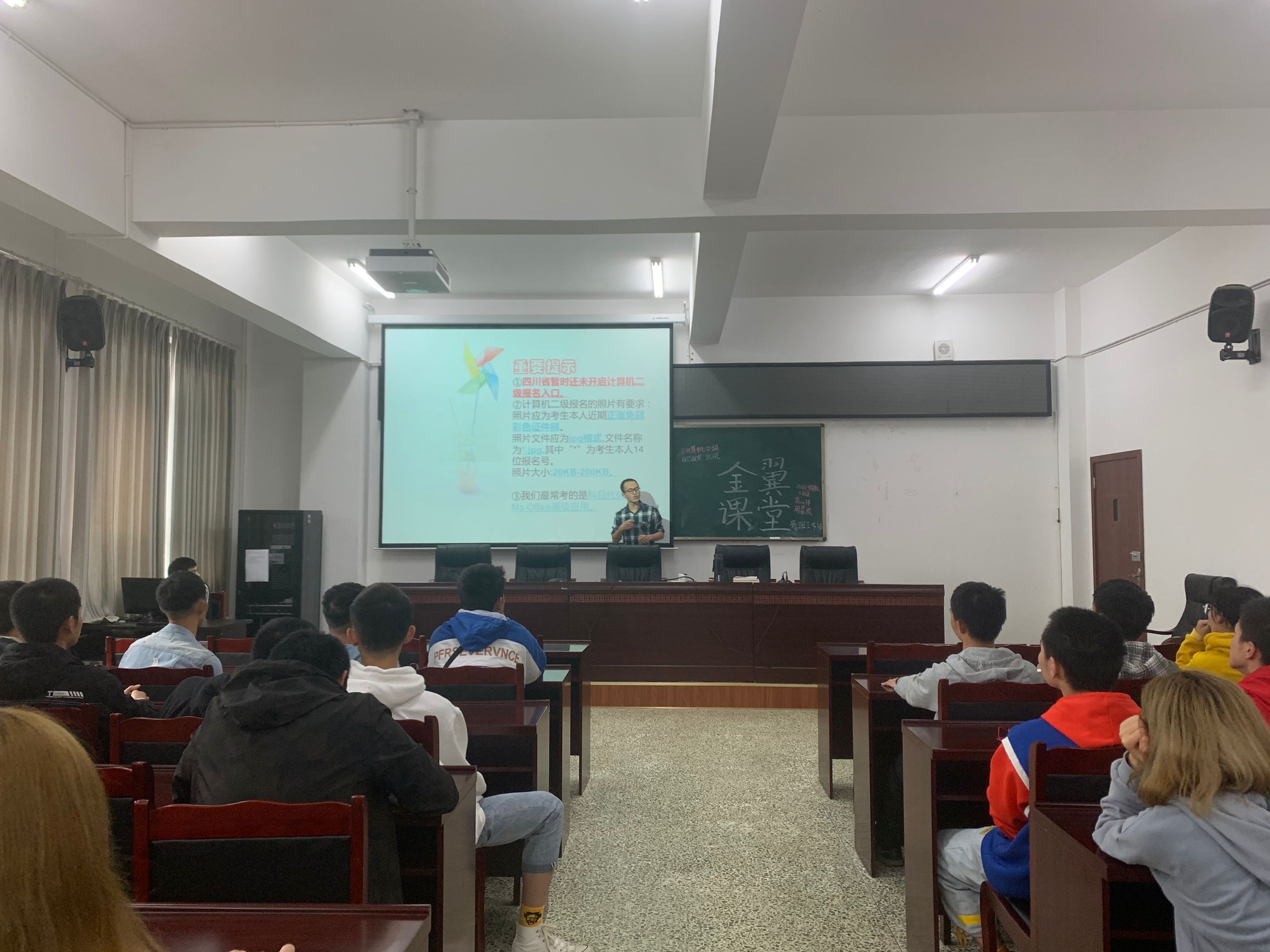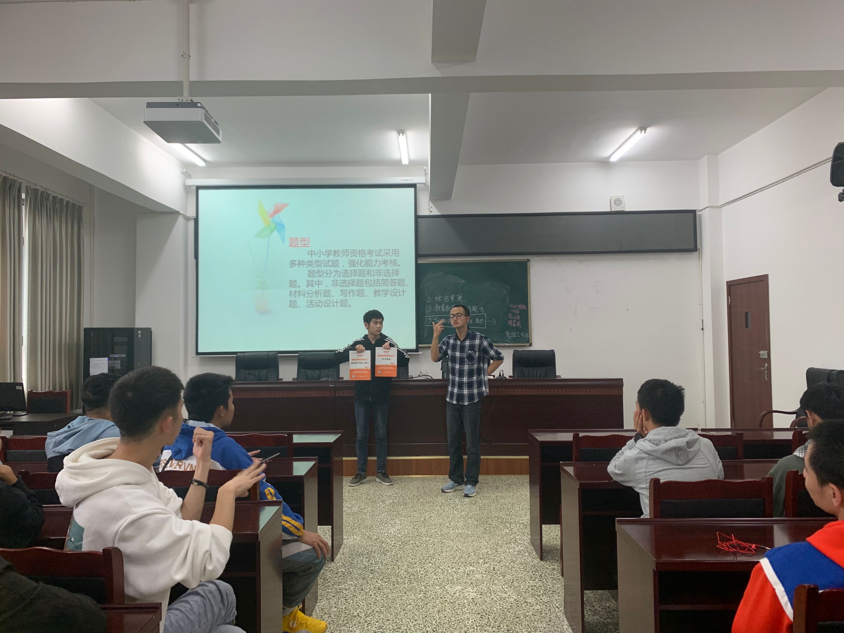 首先高山伟同学以自身计算机二级考试和备考教师资格证的经历为例,向大家讲明了大学生努力提升自身素质的重要性,他从考试的性质、方式再到考试的题型和报名方式等方面为家分享了计算机二级和教师资格证考试的报考注意事项。他还用PPT展示一些考试真题,让同学们对教师资格证考试的方式有了更进一步的了解。期间,同学们对不懂的地方积极提问,他一一为大家解答。他还强调,计算机二级是技能型的证书,就和驾驶证一样,不是说你有驾照就一定要当司机,也更不是说你考上了计算机二级就一定要去从事计算机二级的工作。之后,他建议大家平常学习要劳逸结合,合理安排自己的时间,不要有过重的心理负担,让自己的生活有节奏感。最后,高山伟为大家展示了一段趣味视频,在活跃课堂氛围的同时,也向大家分享了一些视频拍摄、剪辑的技巧。