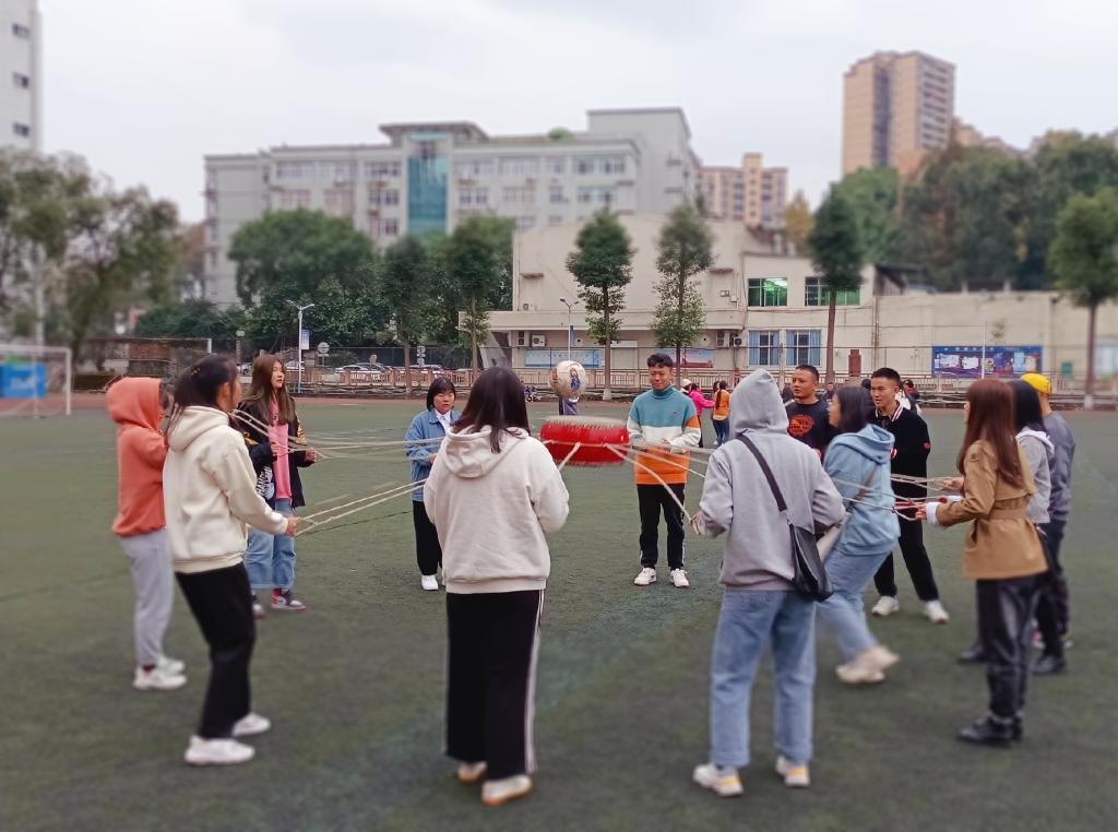 活动开始,第一个游戏名为“飞夺泸定桥”,每组成员在主持人的指令下各排成一列纵队进行组间比拼,随着主持人发出“摇摆不定”的口令,同学们在紧张又激动的心情中迅速进入状态,每位组员都被调动起了十分的热情与专注投入活动,现场气氛迅速热烈起来。第二个游戏名为“滚雪球”,自此开始,团队成员之间的配合越加紧密,各小组无一例外选择了体院的同学“打头阵”,而被选中的同学们也不负众望,都拼尽全力为后面的同伴争取时间,在欢快音乐的陪伴下,各组成员们手拉手,冲过了一道又一道的阻碍,风中飘扬的发丝也洋溢着青春的力量。最后一个游戏,也是难度最大的一个——“击鼓生花”,各组成员们紧握手中的麻绳,控制着鼓面去掂起篮球。即使一次又一次失败,也没有一个小组选择放弃,而是抓紧时间总结经验再次尝试。最终,本次团校实践课在一片欢声笑语中圆满结束。