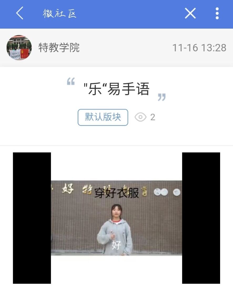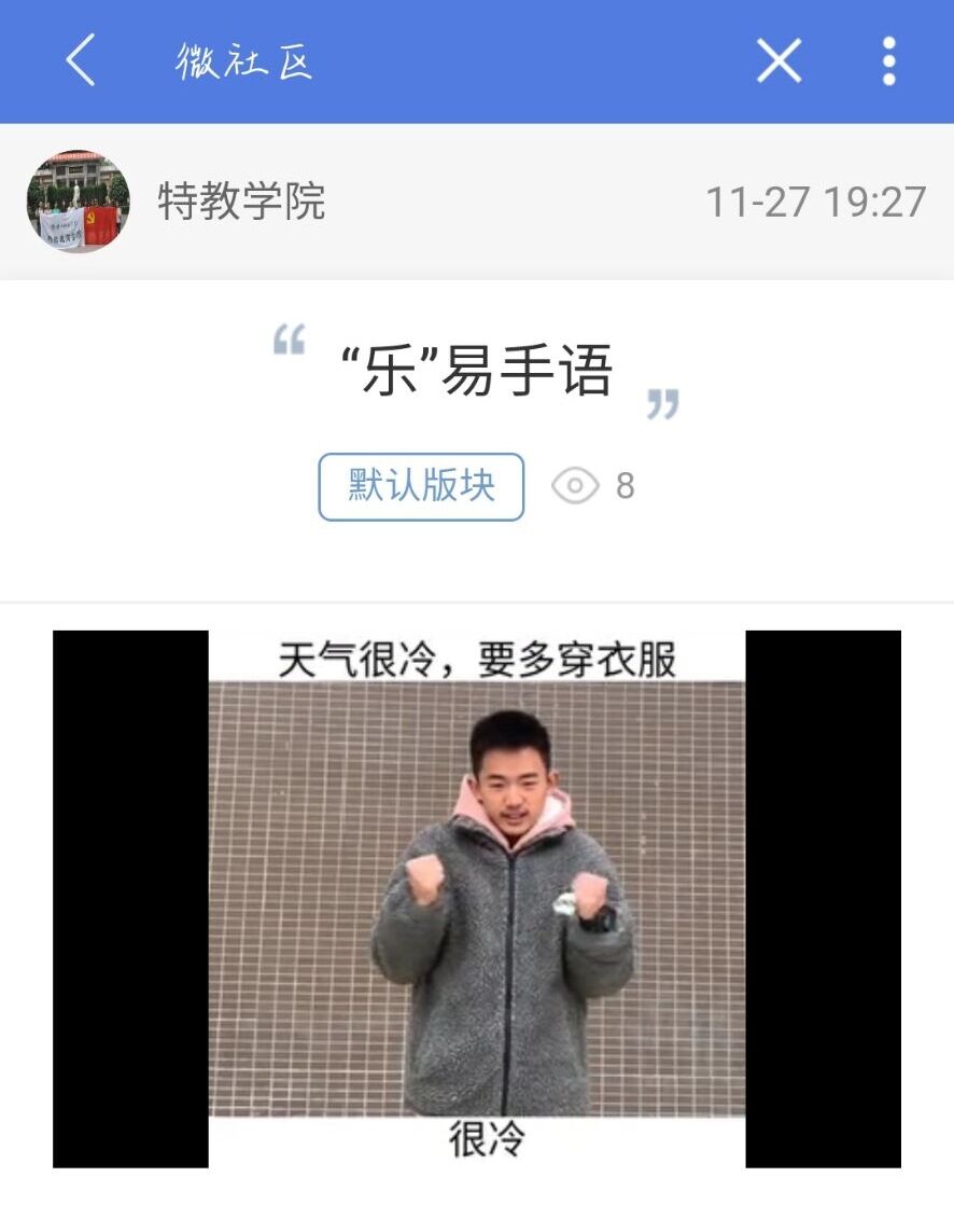 本网讯(文、图/饶雪钰)我院易班分站于十一月份举办了分站特色活动——“乐易手语”, 以拍摄手语视频推送到易班平台的方式,推广一些日常手语。本次活动邀请了2020级特教三班杨彬焱和王露洁进行手语视频拍摄,并通过易班推送。