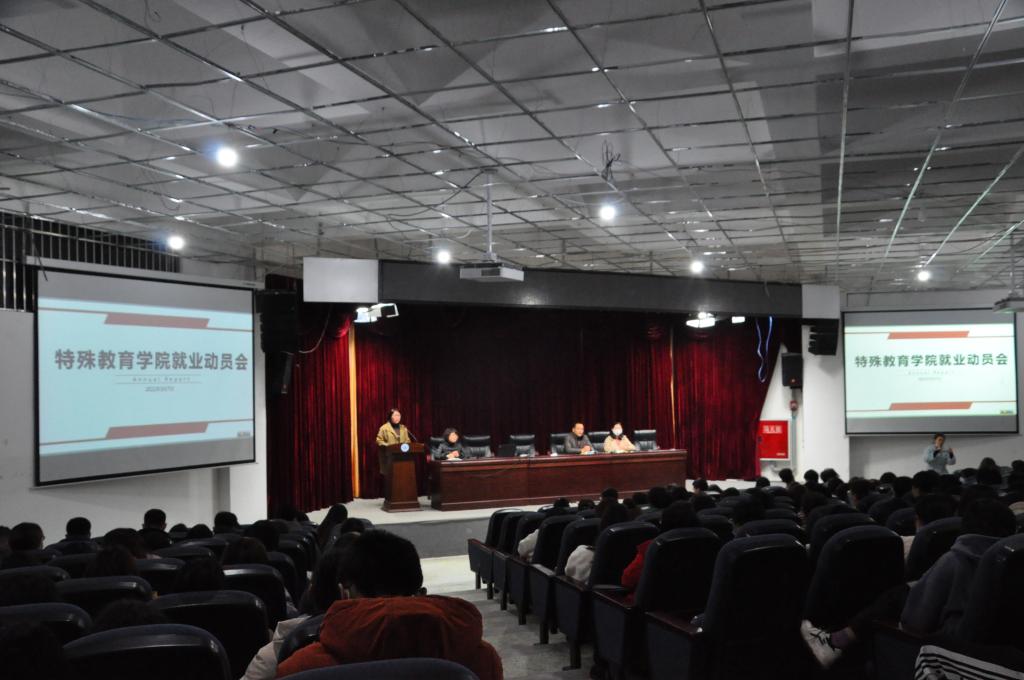 大会开始,兰芳首先热烈欢迎2017级毕业班学生返校,然后详细介绍了历年学院毕业生一次性就业率、就业去向、用人单位招聘要求等情况。然后张梅从国家特教事业发展方面向同学们详细分析了特教职业意义,她告诫2018级的学生不要局限于特殊教育学校,其他领域同样需要特殊教育的人才,而我们在面对特殊需要儿童时,更应该看见教育的重要性,提高自身的专业性。接着,刘宗泉从就业观念上提出不要“唯专业”的观点,鼓励同学们拓展就业思路,从“红黄蓝黑”四条道路,即根据自身实际,尽早决定选择深造还是就业,选择体制内还是企业,把握机会积极就业,提醒同学们准备好自荐材料,做好毕业论文答辩,并向同学们表达了能成功就业的美好祝愿。