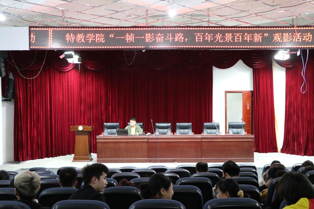 本网讯(文/吴霜 图/李沅烩)4月7日,特教学院分团委组织学院各团学机构的学生干部、各年级班团委员以及43期入党积极分子在特教大楼A栋学术报告厅开展了第一场“党史”教育观影活动,本次活动由分团委书记朱志刚主持。