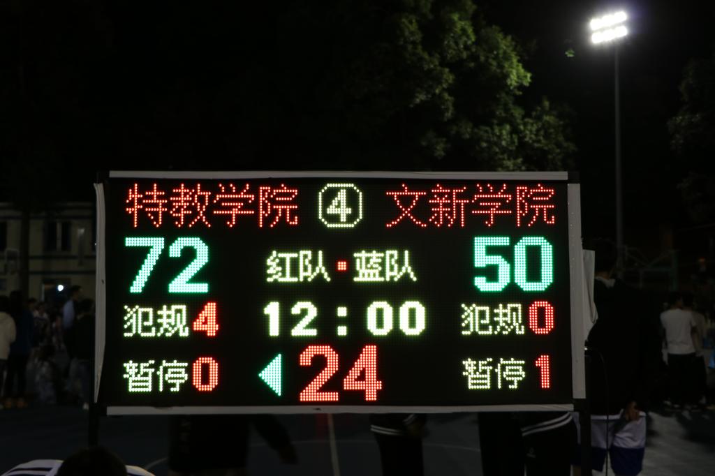 4月28日晚,特教学院在南校区篮球场一号场地迎来了首场对决,对决文新学院。比赛哨声吹响,1号曲别甲尔首球进框,成功拿下两分。紧接着,12号王梓阳、77号眭强相继进球,再拿四分,而后77号眭强远投再获三分!场下喝彩声不断响起,场上队员们配合默契,在记分牌一次次的翻动中,上半场比赛结束,特教学院以44:33获得上半场的胜利。接着,女子篮球队上场,第三场比赛开始。32号段麟波定投获得一分后,23号钱淼洁乘胜追击,再夺四分,第三场比赛以56:36结束。中场休息,啦啦队随着音乐上场,用舞蹈为运动员们加油打气。在期待中,比赛进入最后一场,1号曲别甲尔上场快速夺球,首进一球,77号眭强紧随其后,再进一球,最终,1号曲别甲尔以一个二分球结束了本次比赛。特教学院以72:50的比分获胜!