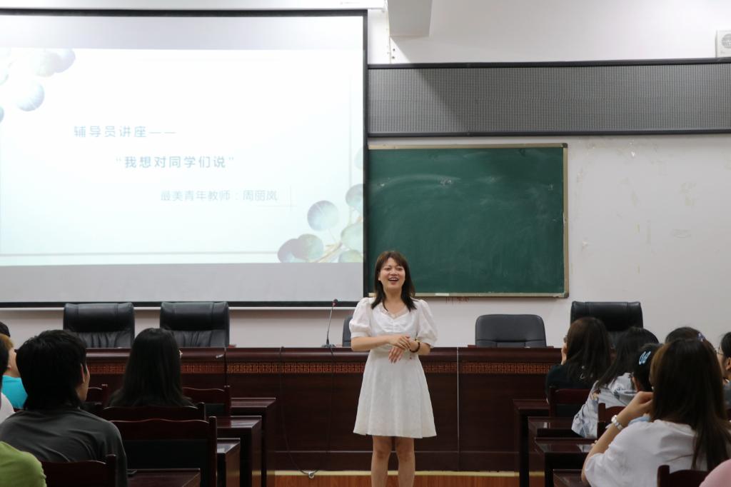 本网讯(文/吴霜 图/张卿)5月16日晚,“最美青年教师”候选人周丽岚在特教大楼A栋406开展辅导员讲堂——“我想对同学们说”主题讲座,学院2020级各班部分同学参加。