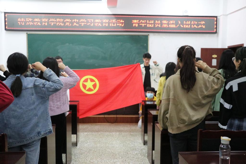 仪式开始,全体起立,迎团旗、唱团歌,由领誓人范怀娇带领宣誓,铿锵的誓词在教室中回荡,引领大家更加坚定入团初心。随后,范怀娇带领大家回顾五四运动的重要史实,她谈到,五四运动爆发于民族危难之际,是一场以先进青年知识分子为先锋、广大人民群众参加的彻底反帝反封建的伟大爱国革命运动,是一场中国人民为拯救民族危亡、捍卫民族尊严、凝聚民族力量而掀起的伟大社会革命运动,是一场传播新思想新文化新知识的伟大思想启蒙运动和新文化运动。朱志刚进而讲到,历史是最好的老师,它忠实地记录下每一个国家走过的足迹,也给每一个国家未来的发展提供启示。新时代中国青年传承发扬五四精神,就是以习近平新时代中国特色社会主义思想为指引,投身实现中华民族伟大复兴的宏伟事业。在场团员听后无一不备受鼓舞。仪式最后,周小渝与青年团员们一起,重新学习了团章,了解了团员的权利和义务。