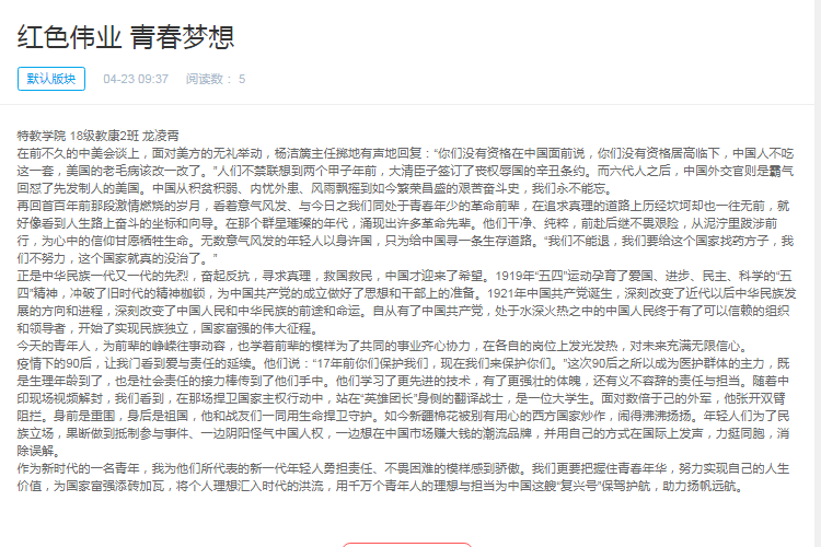 本网讯(文、图/饶雪钰)一百载风雨洗礼,一百载峥嵘岁月,一百载辉煌成就,4月19日—5月14日,特教学院易班分站面向全体学生开展了“红色伟业,青春梦想”主题征文比赛。