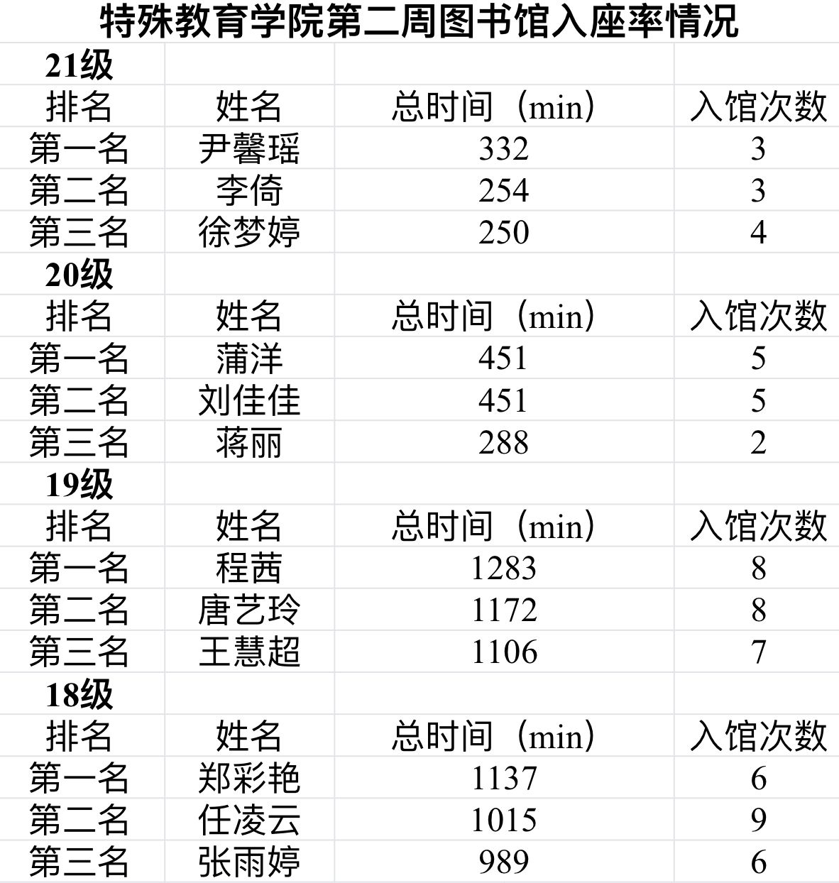 特教学院分会学习部对第二周院内图书馆学习情况与上座率进行了检查。从学院的对比来看,betway西汉姆联平台与上周排名相同,位于第十四名。排名相对来说比较靠后,学院的同学们下周应继续努力,争取在下周提高学院排名。从院内年级的对比来看,第二周的入座情况比第一周要好很多,时间和次数都有所上升,同学们要继续保持和提高。同时,同学们应该多利用自己的空闲时间去图书馆提高自己。