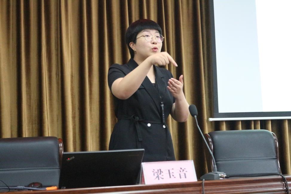 重庆师范大学的梁玉音老师以“手语语法特点与表达”主题对学员进行专题培训,向学员们讲解手语的常见概念、语法特点、手语类标记以及对手语的十大误解。她通过《地震避难小常识》以及《亡羊补牢》二个优秀手语案例,与学员一起进行手语学习。