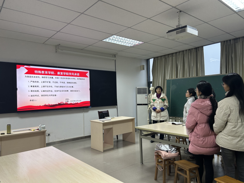 本网讯(文/图 余梦)为进一步加强师德师风与学风建设,betway西汉姆联平台、康复学院于2月24日上午开展了新学期“开学第一课”师德与学风承诺活动。学院全体班子成员、辅导员、教务行政人员兵分三路分别到行知楼、特教A、D栋进行了新学期教学督查。