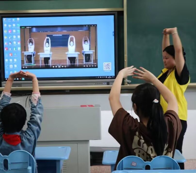 下午,志愿者们提前抵达乐山市特殊教育学校与老师们进行对接。在老师的指导下,志愿者们分组进入不同班级开展互动活动。低年级教室里,“老鹰抓小鸡”游戏正如火如荼地进行着。孩子们银铃般的欢笑声此起彼伏,一张张红扑扑的小脸上写满了兴奋与喜悦。高年级组的室内跳操区域,伴随着动感的音乐节奏,志愿者们以标准有力的动作示范引领,学生们精神抖擞地跟练,跃动的身影展现出蓬勃的青春活力。整个活动过程中,志愿者们始终以温暖的笑容和鼓励的话语陪伴左右,细心观察每个学生的参与状态,及时给予个性化的指导与支持。