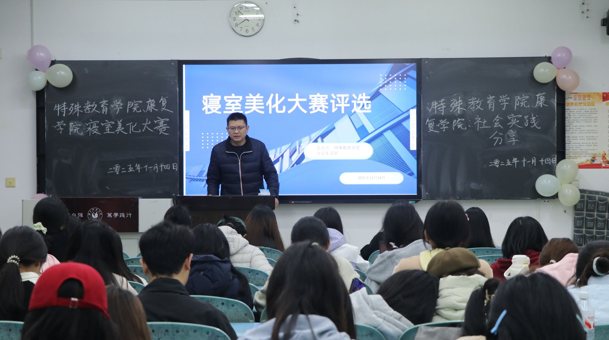 本次大赛分为初赛与复赛两个阶段。11月13日的初赛阶段,学生干部深入各参赛寝室,从美化效果、环境卫生到文化氛围进行实地考核,这正是对同学们日常劳动实践成果的一次严格检验。11月14日的复赛展示中,各寝室代表依次上台,通过图文、视频等形式,生动讲述了室友们齐心协力、动手改造小家的温暖故事。每一处整洁的角落、每一件创意手作,都凝聚着同学们的劳动汗水与创造智慧,多角度展现了他们在劳动中塑造的寝室文化和凝结的深厚情谊。朱以荣在总结发言中充分肯定了同学们的劳动成果。他强调,寝室美化不仅是创造优美环境,更是一次宝贵的劳动实践,寄语大家将劳动习惯内化于心、外化于行,持续优化居住环境,在动手实践中共同成长。