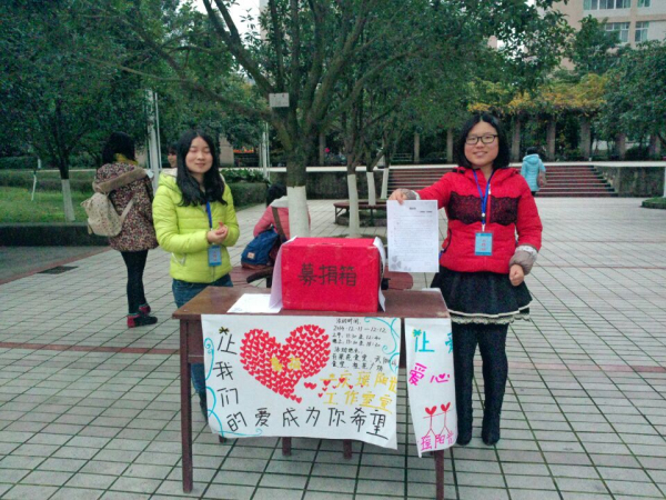 吕飞家庭是农村低保户,哥哥刚刚大学毕业。2012年,吕飞的母亲患了子宫癌,为给母亲治病,家里已欠下十多万元的债;2014年,在准备给母亲做手术的时候,哥哥又被检查出胸膜炎、心脏病。然而,在他们都以为一切不好的都结束了的时候,母亲却在2014年12月6日中午不幸被小轿车撞出3米,脑部严重受伤,至今昏迷不醒。现在手术费,医药费都没有来源。学院在了解这些情况后,迅速组织庆瑶阳光工作室的学生干部开展爱心募捐活动。此次募捐以“献出一份爱,拯救一个家”为主题,呼吁全校学生奉献爱心,帮助吕飞的家庭。工作室分别在桂花广场、百果苑、武珈山食堂等地设点募捐,募捐过程中,虽然寒风肆虐,但所有工作人员都积极地投入到工作中。令人欣慰的是,同学们纷纷响应,捐出5元、10元、20元不等,以实际行动来表达对吕飞同学的帮助与支持!