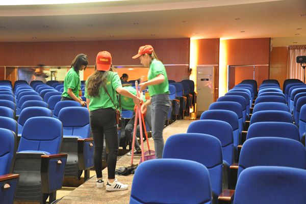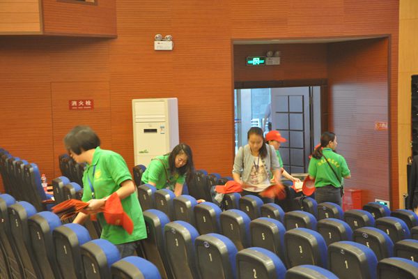 5月22日早上,志愿者早早来到活动现场,并快速地投入到工作中。志愿者分为了引导组、服务组和礼仪组三组。礼仪组快速有序地进行着礼仪、颁奖的排练,以确保正式演出时万无一失。引导组分散到学校的北校门口、桂花广场等处将社会各界来看演出人员带到演出厅。服务组在演出厅打扫卫生以及分配各个座位的水和节目单,为节目正式开始做最后的准备。上午9:00,节目即将正式开始,志愿者分散到演出厅的各个地方为到来的观众指引位置,维持现场次序。