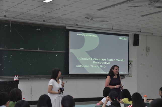 5月29日上午9点,英国雷丁大学(University of Reading)教育学院院长、博士生导师Catherine Tissot博士在行知楼301为我院全体师生作了一场高水平、专业化的讲座——全纳教育视野下的特殊教育就业导向,随同的李素芳博士为大家做了全程翻译。