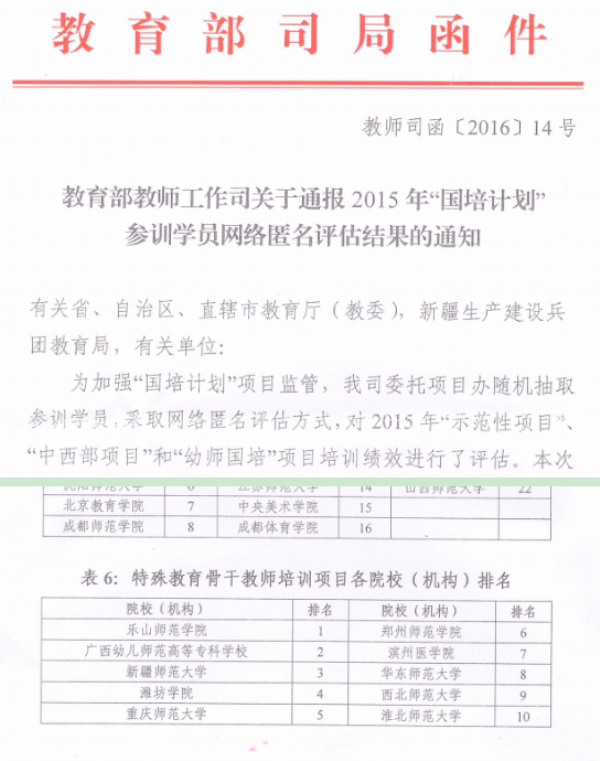 近日,教育部发文通报了“国培计划(2015)”匿名评估结果,我院2015年承担的教育部示范性培训——特殊教育骨干教师培训项目在匿名评估中获综合排名全国第一。