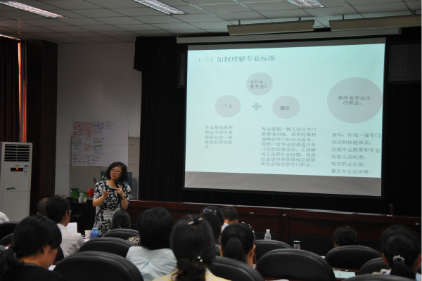 在讲座中,汪红烨从四个方面为培训学员们介绍了特教教师的专业标准。她首先从《特教教育教师专业标准》的颁布背景出发,重点讲解了《特殊教育提升计划(2014—2016年)》的主要精神,她认为教师专业化的水平将直接影响着特教教育的质量。接着从实证研究出发,对比介绍了湖南、四川、河南等省特教教师专业素质的现状,指出需要进一步提高特教教师的专业化水平并且在更多的高等学校增设特教专业。汪红烨还向学员们介绍了我国特殊教育教师专业发展的困难和问题,强调了制定教师专业标准是教育改革与发展的重要性,并通过对《特殊教育教师专业标准》内涵与指导思想的分析,着重讲述如何理解专业标准和制定专业标准的基本原则,也阐释了特殊教师专业标准的框架与内容。最后,她向学员们重点讲解了《特殊教育教师专业标准》的践行措施,强调了特殊教育者的职业准则和教师专业标准的性质,在此基础上,还与学员们共同探讨了特教教师专业发展的问题,讲述了教师职业普遍性和独特性相结合的需要,以及树立学生为本、师德为先和终生学习的教育理念重要性。在参培老师自由地阅读与讨论专业标准之后,汪红烨又从教师的人道主义精神和正确的残疾人观中阐述了特殊教育专业理念与师德,并讲述了特殊教育教师所具备残疾学生教育所需要的复合型知识,使培训学员们充分认识到专业知识的重要性。