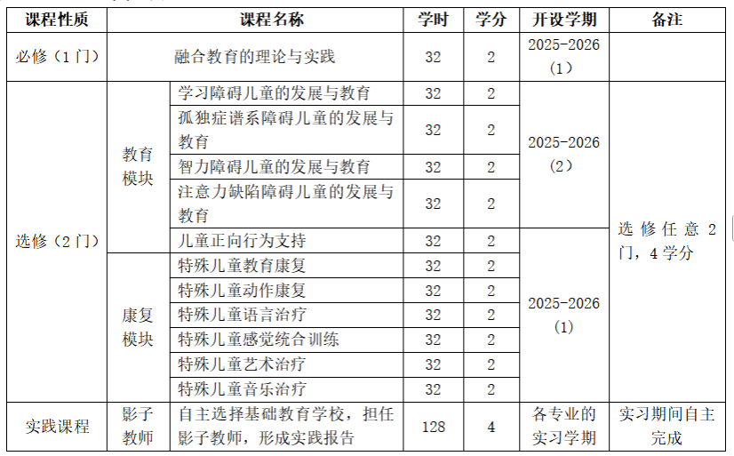 备注:融合教育微专业修读学分要求为10学分,课程设置包括必修课程、选修课程和实践,学分构成为:2学分(必修课程1门)+4学分(选修课程2门)+4学分(实践)。