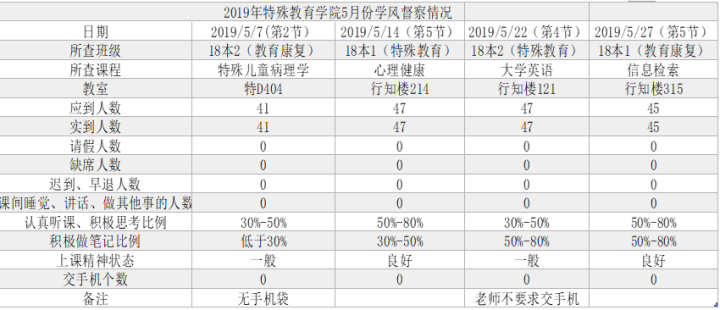 为了加强学风建设,营造良好学院学习氛围,督促学生提高学习积极性,特教学院学生分会学科部于本月组织进行了查课,安排干事于第11、12、13、14周对大一大二大三班级课程分别进行了四次抽查。