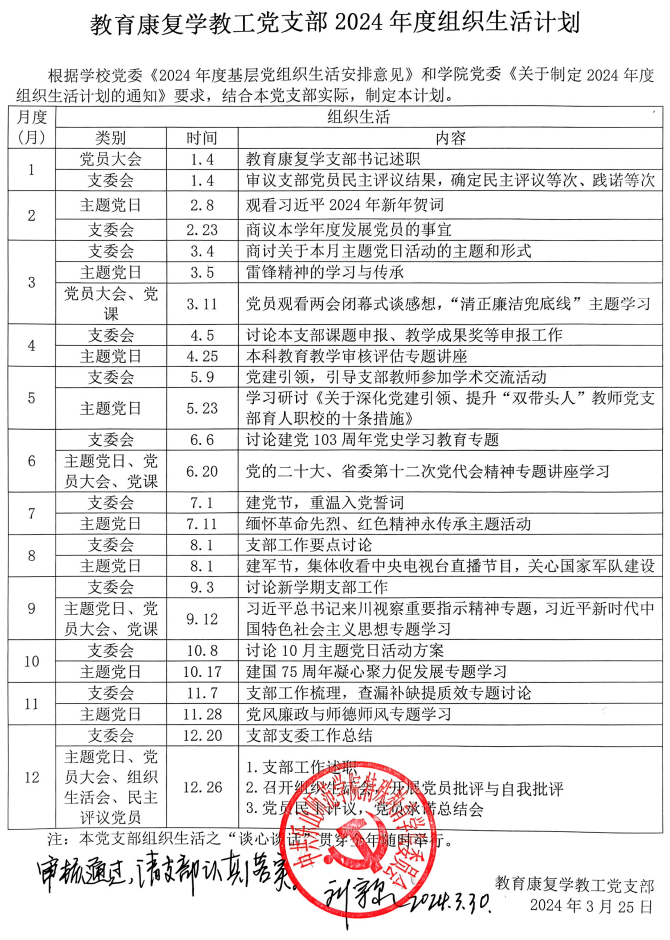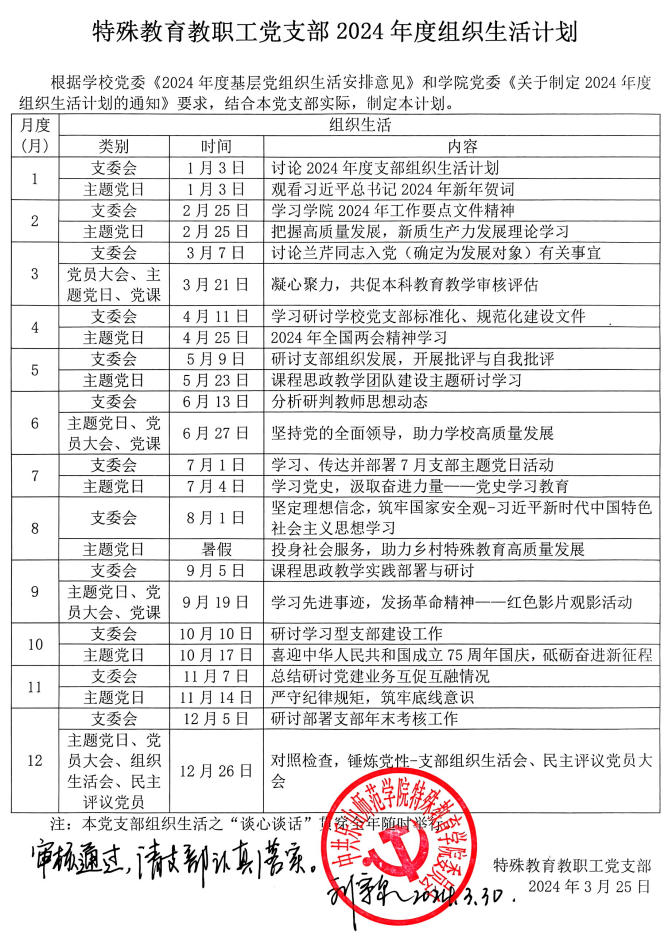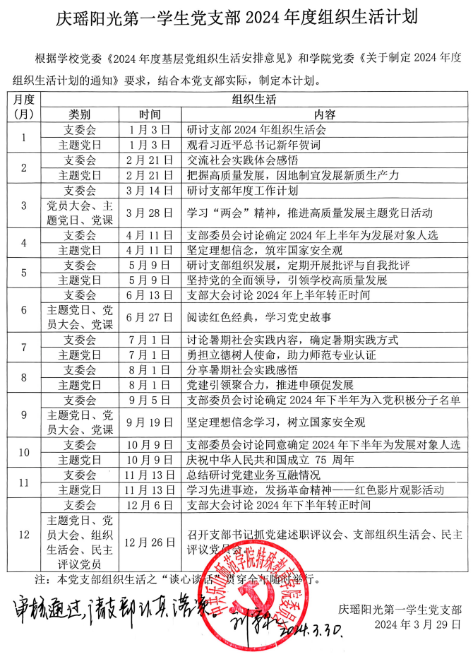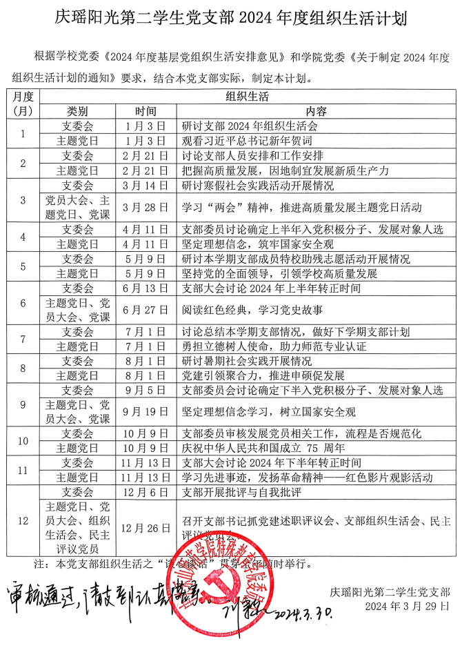 根据学校党委《2024年度基层党组织生活安排意见》(乐师院委组〔2024〕6号)和学院党委《关于制定实施2024年各党支部组织生活计划的通知》安排,各党支部制定了2024年度组织生活计划,已经学院党委审核通过,现予以公布。请各党支部认真落实。