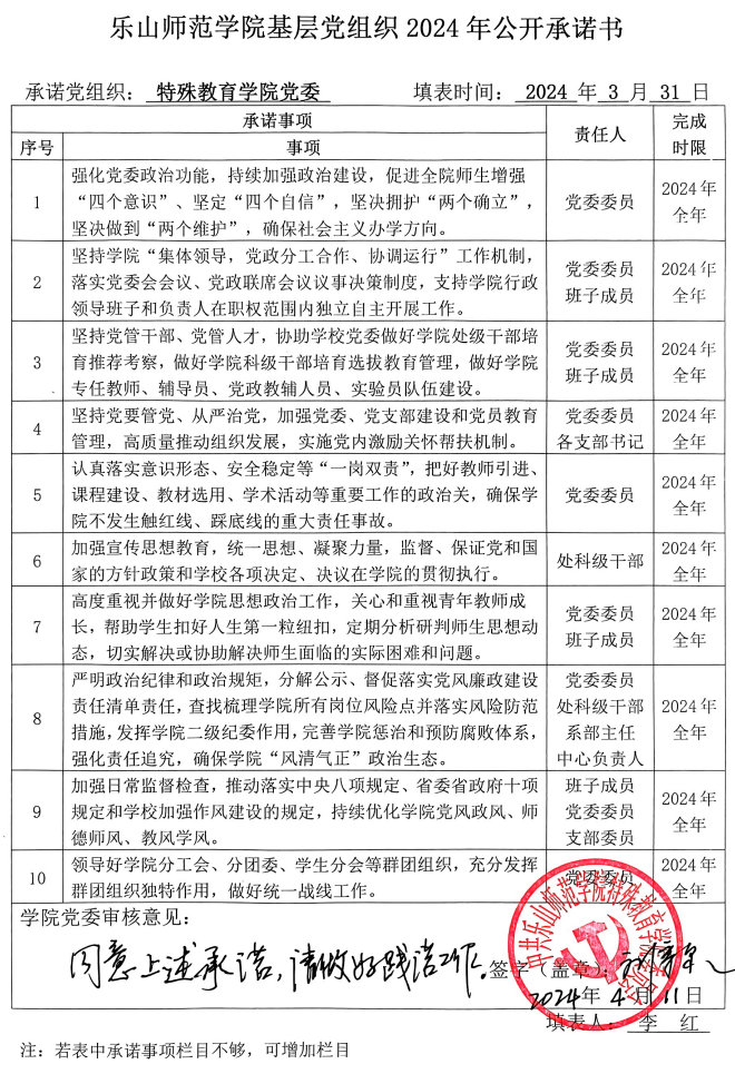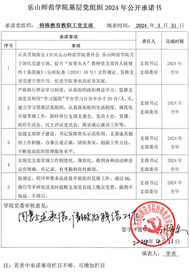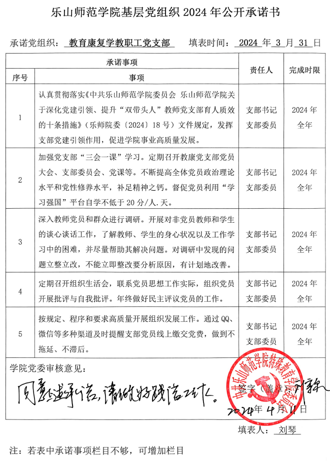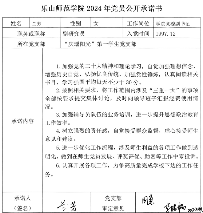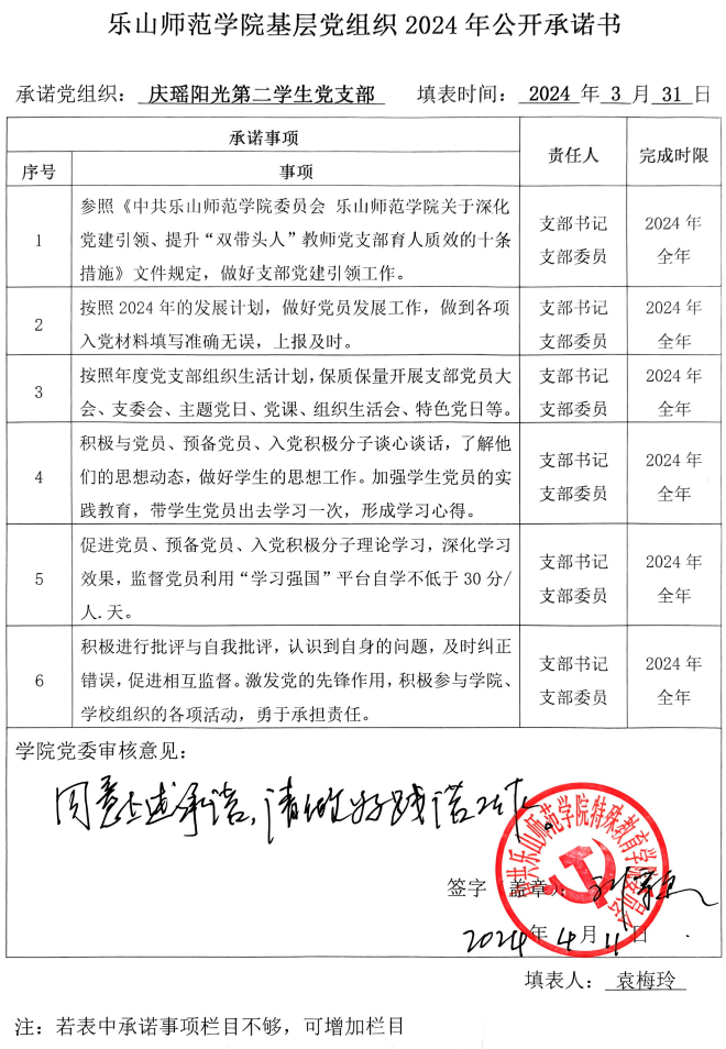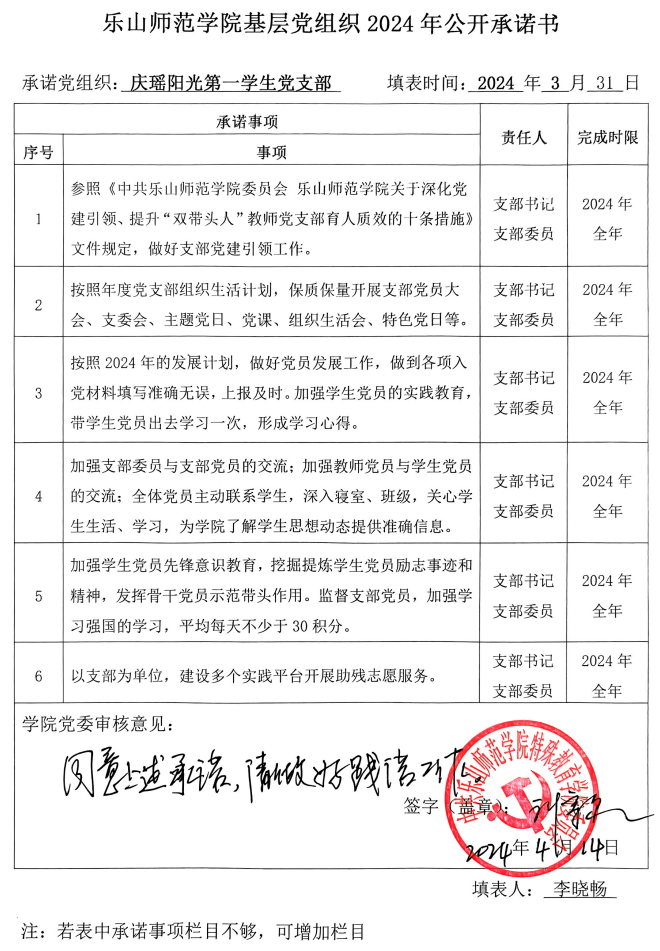 根据学校党委《关于开展2024年党组织和党员承诺践诺的通知》要求和学院党委《关于开展2024年学院党委、各党支部、全体党员承诺践诺工作的通知》安排,现将学院党委、各党支部、学院党员领导班子成员2024年的承诺书以上传扫描件截图的方式予以公布,将全体师生党员(含预备党员)2024年的承诺书以支部为单位建立电子稿文件夹并压缩上传的方式予以公布。请学院党委、各党支部、全体师生党员严格按承诺书所列事项认真践诺。欢迎学院广大师生监督并随时提出意见和建议。