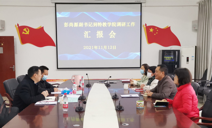 本网讯(文/张梅 图/张敏) 11月12日上午,省纪委监委驻学校纪检监察组组长、学校党委副书记、纪委书记彭尚源,省纪委监委驻学校纪检监察组副组长兼办公室主任、学校纪委副书记兼办公室主任邹大勇到特教学院调研工作,调研汇报会在特教学院会议室举行,特教学院全体党政班子成员、党政办工作人员进行了工作汇报。汇报会由特教学院党总支书记刘宗泉主持。