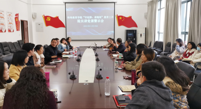 本网讯(文 图/张敏) 为持续深入开展“守纪律、讲规矩”教育活动,将学校反腐败和加强师德师风建设的要求落到实处,11月18日下午, 特教学院举行了以“守纪律、讲规矩”为主题的院长讲党课警示教育大会,全体教职工参加了警示会,会议由学院院长(执行)张梅主持并主讲。