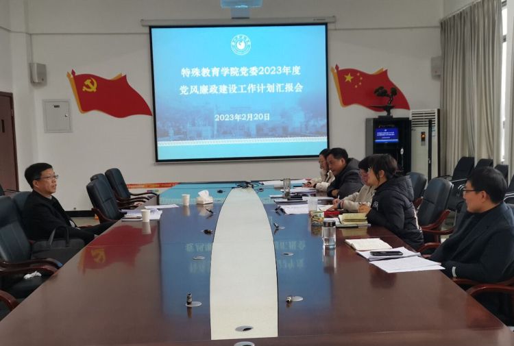 本网讯(文 图/张敏) 2月20日上午,学校党委常委、副校长李朝晖到特教学院、康复学院听取学院党风廉政建设2023年度工作计划汇报并开展集体廉政谈话,汇报暨谈话会在特教大楼A栋408会议室举行,学院全体领导班子成员、院长助理、办公室职员参加了会议。会议由学院党委书记刘宗泉主持。