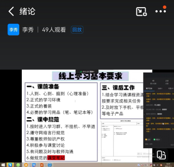 虽是线上教学,教学团队依然重视立德树人、教书育人,在课程教学中充分融入思政元素,积极引导学生在疫情形势下如何更加自律地学习和增强自身竞争力。李秀老师的第一次课对学生的线上课程学习的规范和要求做了具体的说明,为线上课程的正常有序进行奠定了基础。