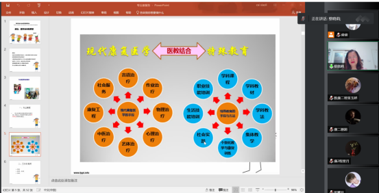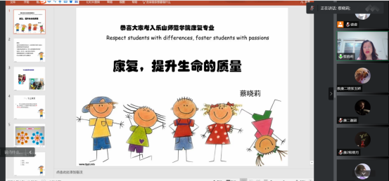 蔡晓莉从自身经历出发,深入浅出的介绍了教育康复学专业的就业前景、就业领域、未来的服务对象以及将要学到的教育康复技术。举例介绍了作业治疗、言语语言治疗、物理治疗、心理疗法、艺术治疗、认知康复、感知觉训练等治疗技术在未来工作中的作用。同时还对同学们进行专业引领,帮助同学们树立正确的教育康复观,建立起专业自信。主题分享结束后,同学们积极提问发言,课堂氛围活跃、气氛融洽。