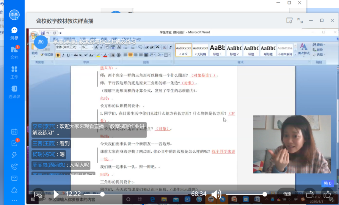 相对于听障班的课程,健听学生的网络教学看似要轻松一些,但问题也不少。本学期李老师任教的18级教康班的《特殊学校数学教法》和19级教康班的《智障儿童发展与教育》都是理论性强且课程结构复杂的两门专业课程。网络教学无法实现师生面对面,学生“人机分离”的现象时常发生,让李老师对学生的学习情况很是担心。为了提升学生课堂积极性,不同课程采取不同办法,《智障儿童发展与教育》让学生组织汇报文献,提高学生参与度,拓宽学生知识面。《特殊学校数学教材教法》在实践中教学的环节李老师先让每个学生自己设计教学编写教案,每一份教案李老师都有仔细的阅读,并做了详细的批注,在上课和课余时间时又逐一的讲解,让每一个学生更能查漏补缺,知识学习也更加扎实。这样用心的李老师也感动了班里的学生,同学们在最后连麦试讲的时候基本都能掌握解学结构,教学准备也越来越积极。