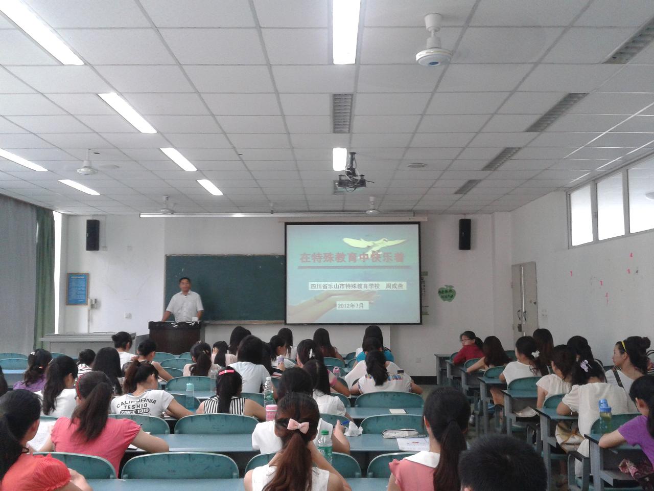 在特殊教育中快乐着 (教科学院新闻中心讯) 这次讲座的主题为“在特殊教育中快乐着”,周校长主要是给大家讲述了现今我国的特殊教育的发展状况,还讲了在此大环境下的乐山特校的情况,并对这些情况做出总结,提出了特殊教育将来的发展趋势,总的来说是愈发明朗,愈发向上的。周校长还谈到我们特教的学生将来走上特教岗位后应该肩负的责任与重担,要求我们学生应该培养良好的职业道德。 在讲座过程中,周校长还给我们看了他在挪威交流学习时候的相片,我们看了以后都很羡慕。并在内心里暗暗提醒自己,一定要学好专业知识,让自己以后走上工作岗位以后能够更好地发挥自己的才能!