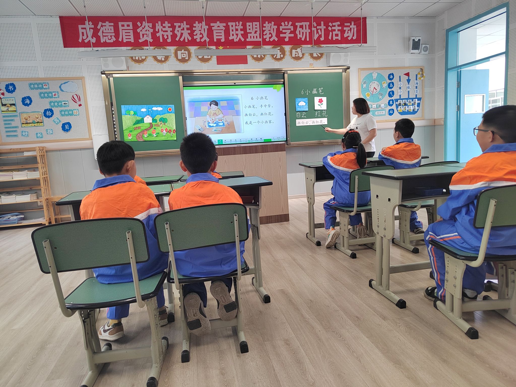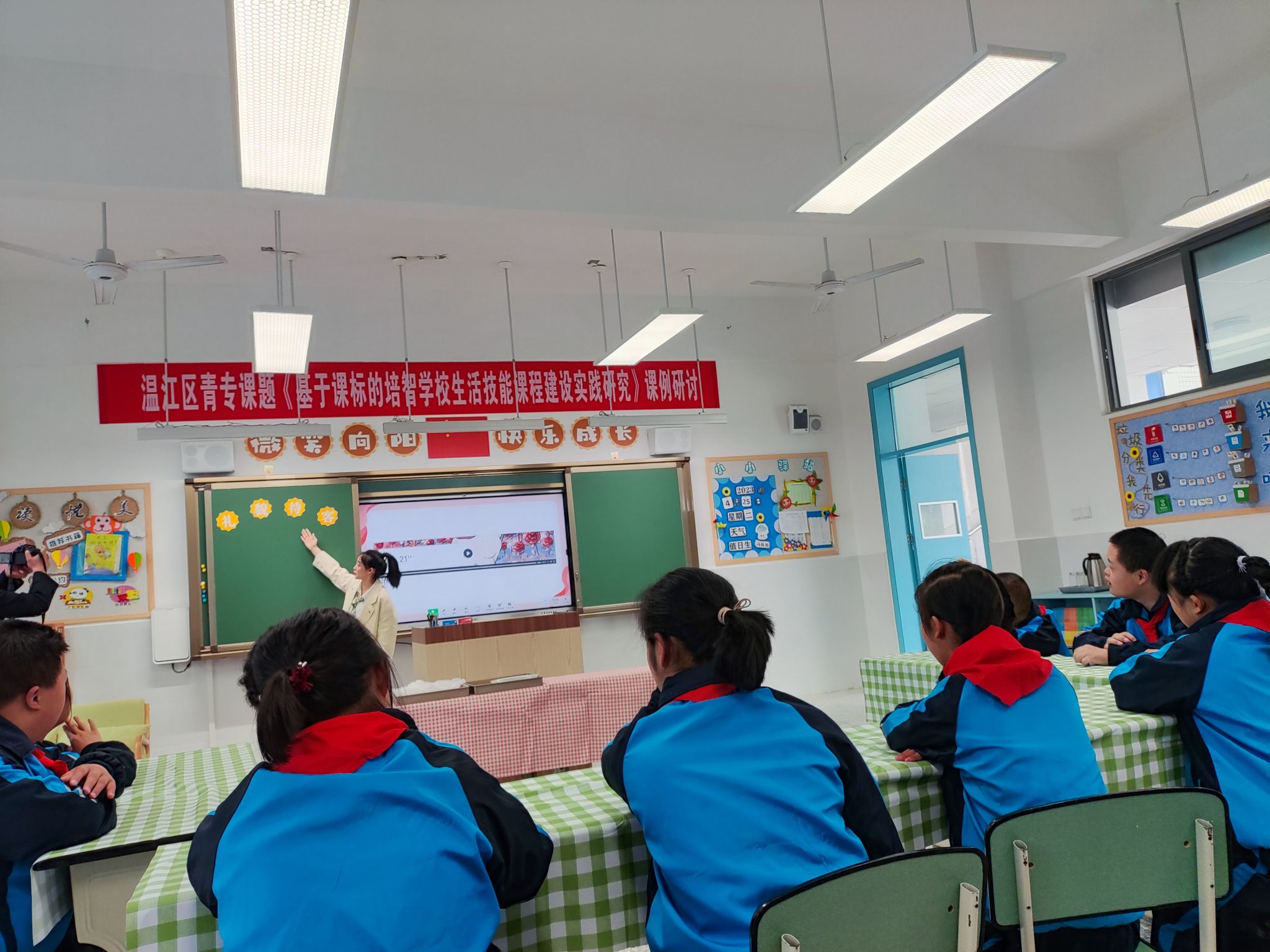 首先,三位系主任观摩了温江特校教师展示的“五育”背景下的示范课。其中生活语文《小画笔》从学科内进行“五育”融合,向美课程《与风筝与绘》从特殊教育校本课程进行“五育”融合;生活技能《礼貌待客》则从生活技能和劳动教育两门课,进行学科间“五育”融合,教师的讲授及课后的说课,呈现了精彩纷呈的课堂效果,将“五育”融合课程的实施,展示的淋漓尽致。