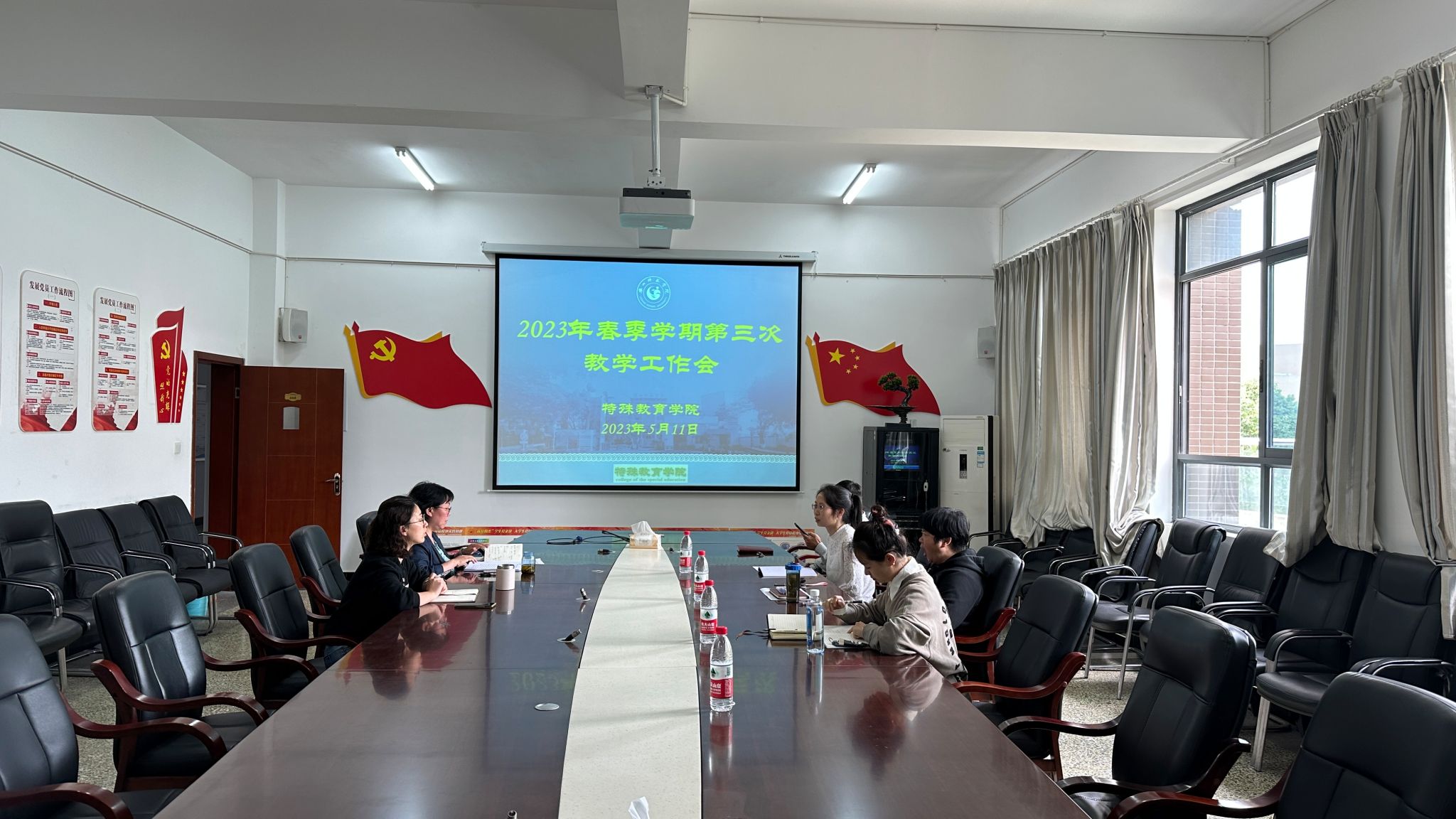 本网讯(文、图/汪科)5月11日下午,特教学院在特教大楼A408召开了2023年春季学期第三次教学工作会,特教学院院长张梅、副院长魏欣、院长助理王振洲及各专业负责人、系部主任参加了此次会议。会议由张梅主持。