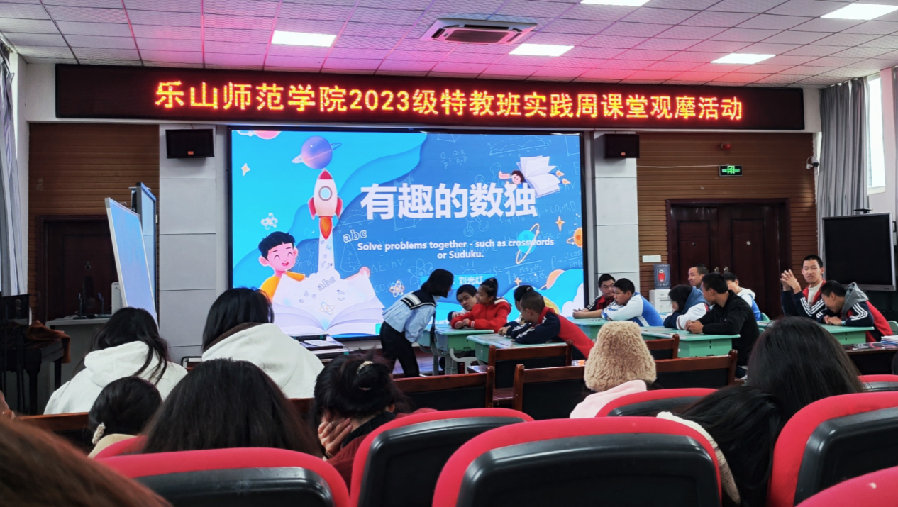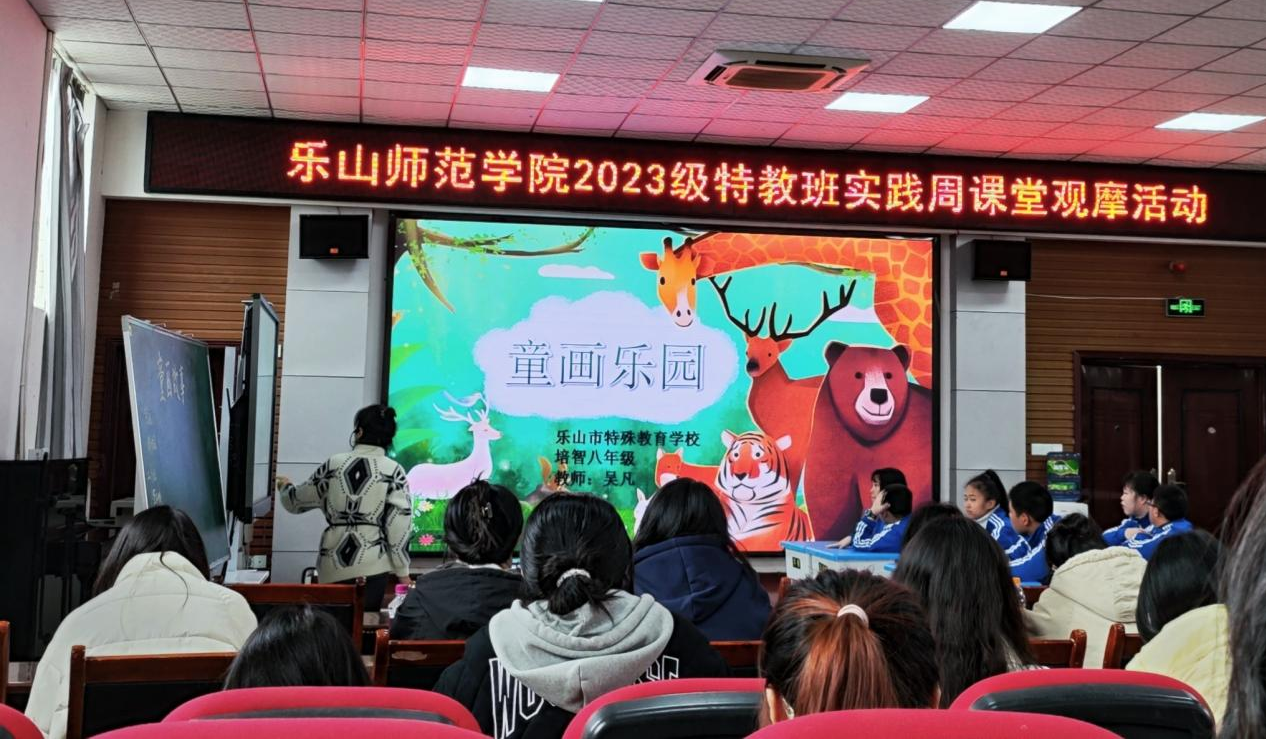 11月19日和21日,同学们来到乐山市特殊教育学校进行教育见习活动。在这两天的时间里,同学们进行分组随班听课,对于听障学生和培智学生的课程有了一定的了解,学习到了许多普通课程的特殊教学模式和教学方法。通过示范课观摩,学习教学方法的运用,如讲解法、问答法、讨论法、演示法、情景教学设计等。示范课课程教学环节的呈现,展示了教师语言和肢体动作、课件的运用及制作、板书设计、活动组织、师生互动、多媒体辅助设备及教学资料的使用等。