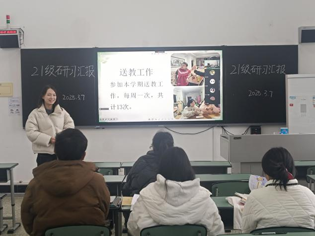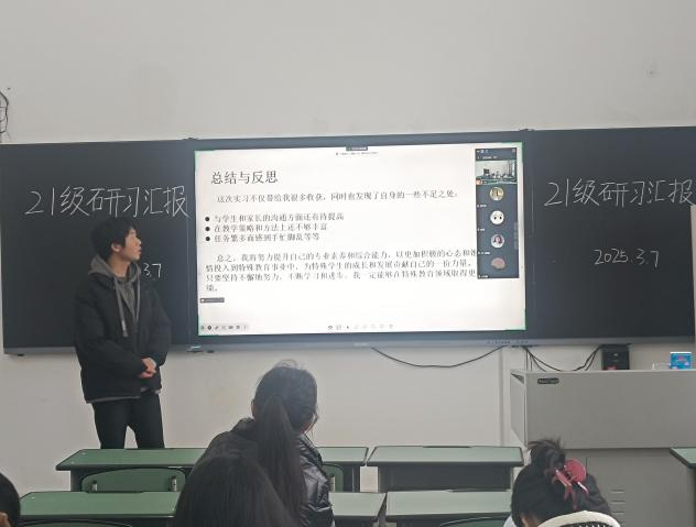 经过为期两周的集中研习,3月7日在研习工作小组的指导下,21级师范生教育研习汇报活动在特教大楼A栋顺利开展。此次汇报活动共分为6个研习组,每个组的师范生们通过线上线下结合的方式对实习中的教学、班主任工作、实习经验等进行了汇报,总结实习、研习经验的同时也认真反思了实习、研习中的不足,强化了特殊教育、教育康复学专业学生教师职业能力,促进了同学们的交流与成长。
