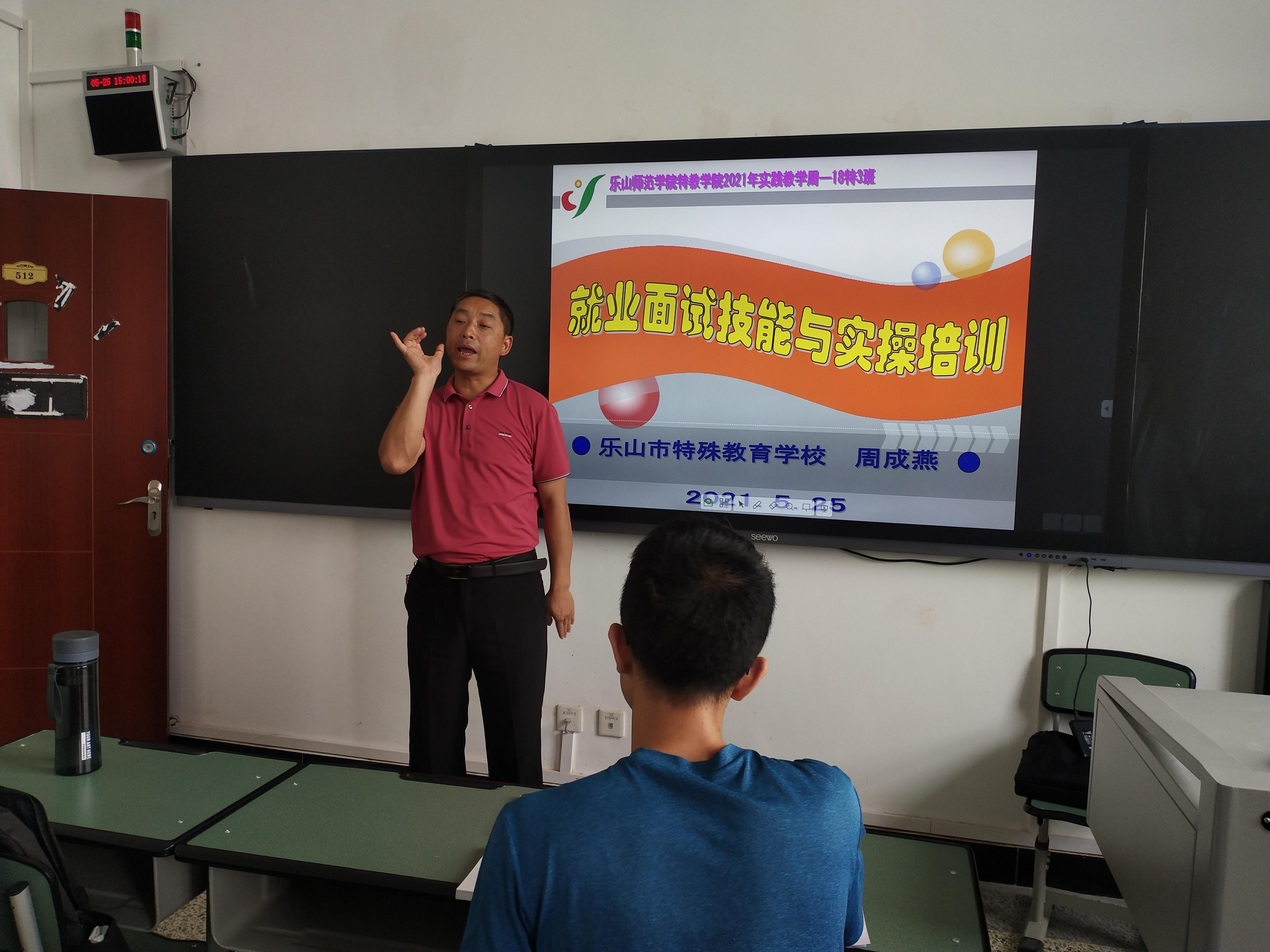 18级特殊教育(听障)3班实践周教学活动着重从实习准备、考研和就业面试三个方面进一步夯实大三学生的专业能力和素质,先后邀请文都教育、中公教育的专业讲师为学生进行考研政治、英语培训并由我院专业手语老师苏诚、生辉、袁梅玲进行实时翻译;邀请具有丰富面试经验的乐山特校副校长周成燕对该班学生进行就业面试技能培训;邀请我院首位考取研究生的优秀听障学长陈润卿进行考研经验分享与交流;邀请通过了教师资格证笔试和面试的优秀听障同学高山伟进行教师资格证考试经验分享与交流;邀请四川省通用手语推广大使,我院优秀教师周丽岚进行听障普通话考试指导。通过校内外专家与朋辈榜样的示范作用,帮助该班学生进一步明确未来的规划并提升各项技能。