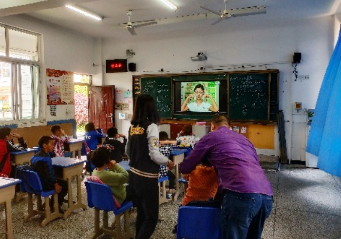 周成燕老师带领同学们观摩了课间眼保健操,大家在教室里现场感受了现代信息辅助技术的直观形象对聋同学需求满足和缺陷补偿的效果。陈钰同学还对不太会做眼保健操的小朋友进行了个别辅导。